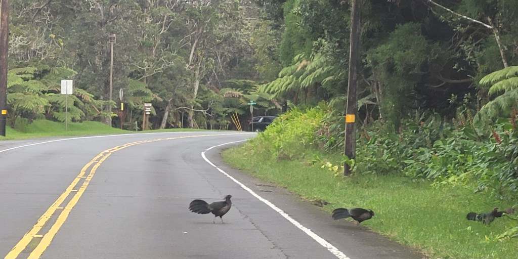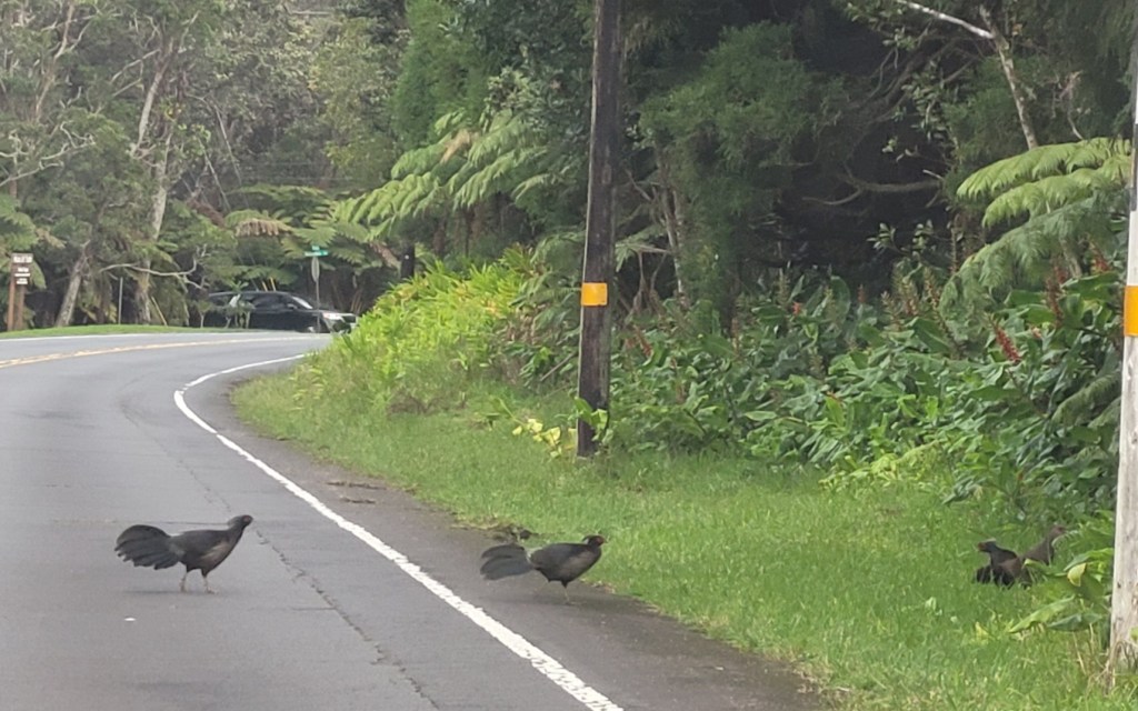 There are chickens everywhere in Hawaii. Chickens wander all over the place. I have no idea if anyone owns them, or collects eggs, or anything. The chickens are just here: out and about, standing around, crossing things.