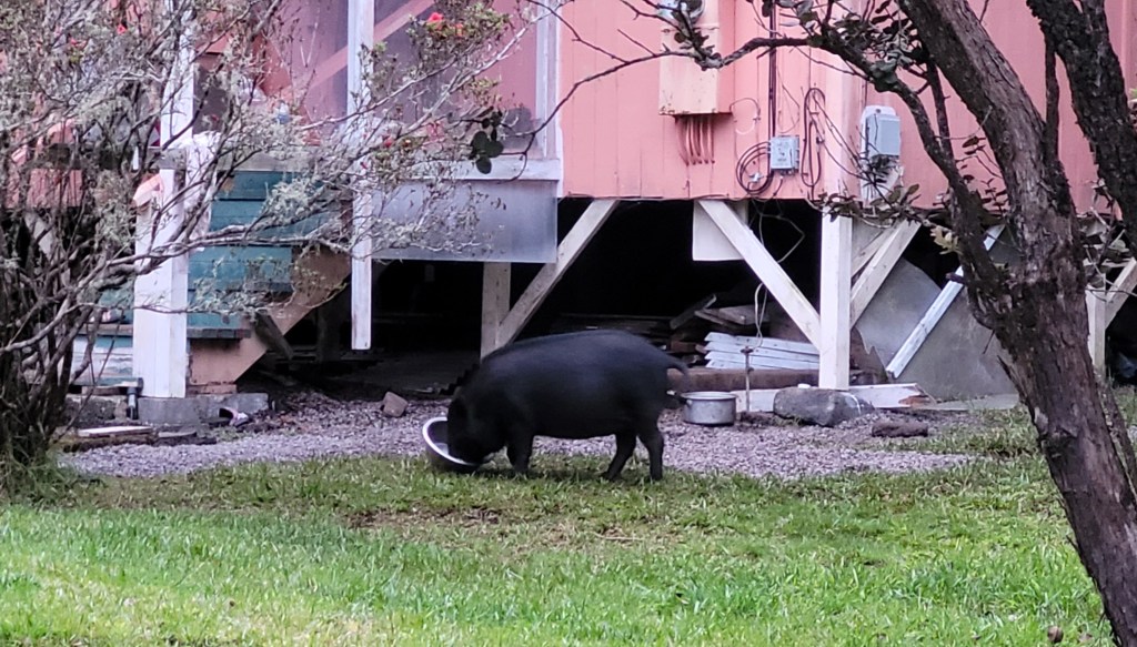 There are many wild pigs. They just cruise into people’s yards. I am pretty sure this one in Volcano was a regular.