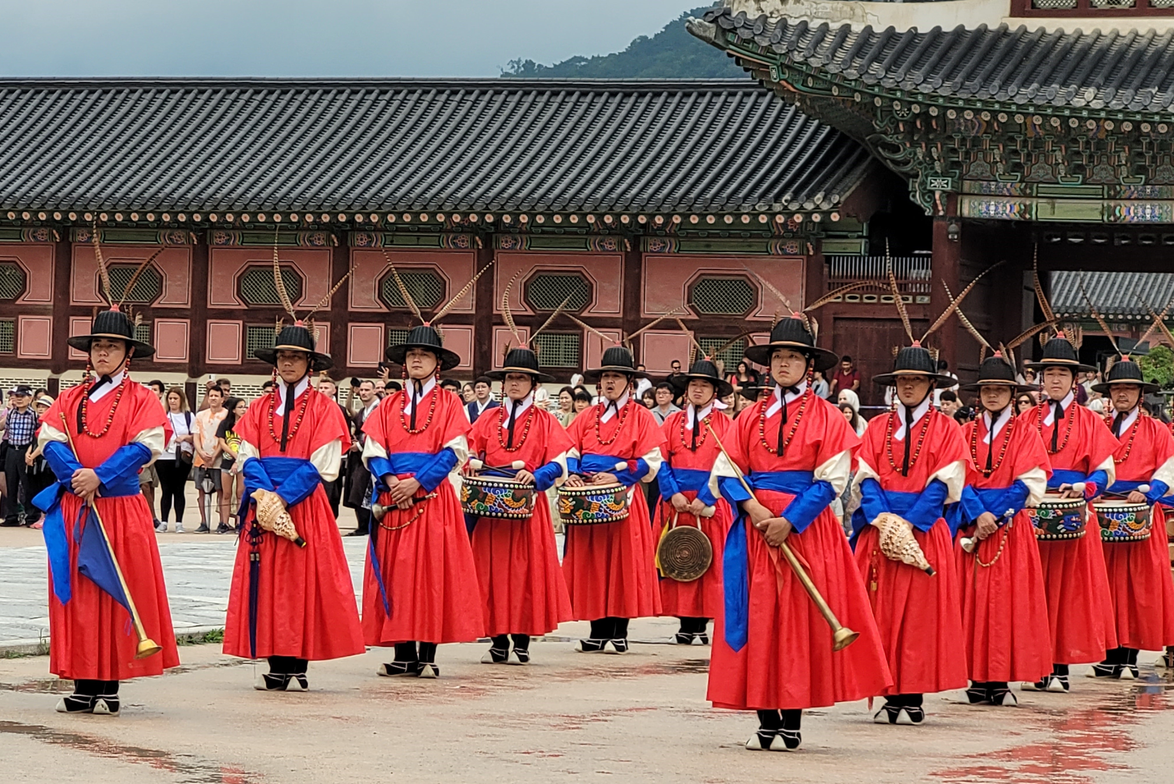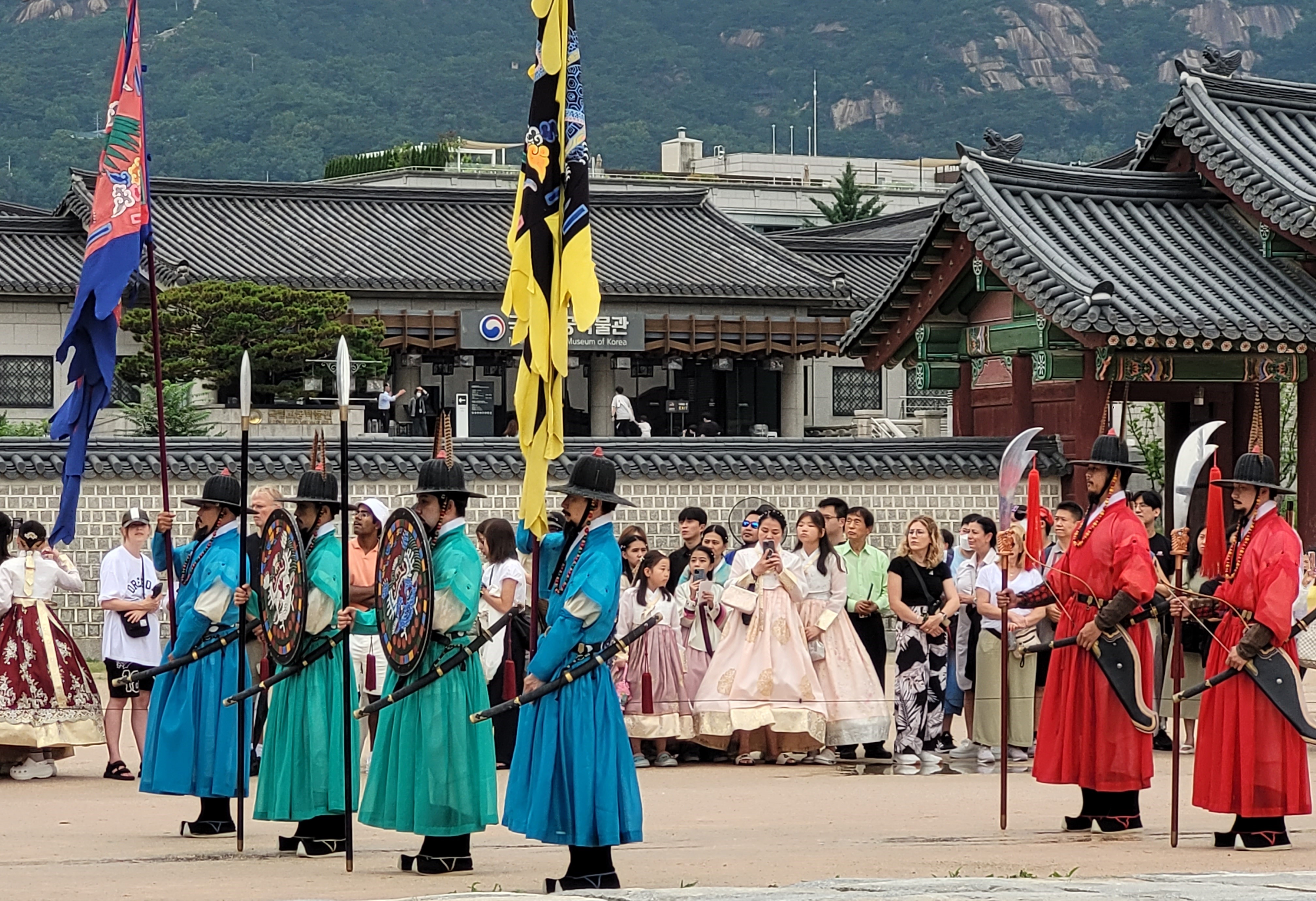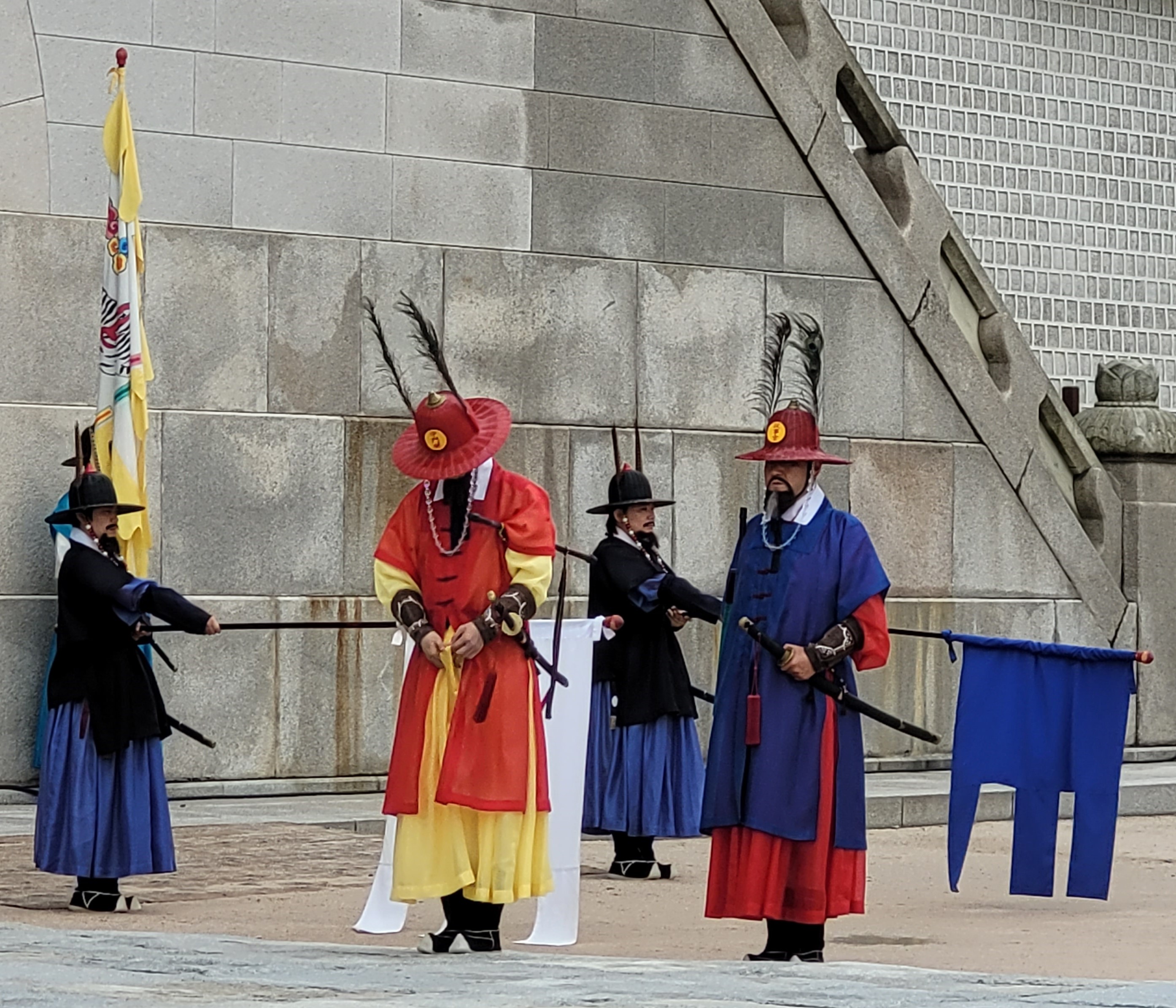 That day we were all watching the Changing of the Guard at Gyeongbokgung Palace (1394, built by King Taejo, first king and founder of the Joseon dynasty), which is a lot of drumming, flags, marching, shouted commands, dress uniforms, and dramatic ceremony.