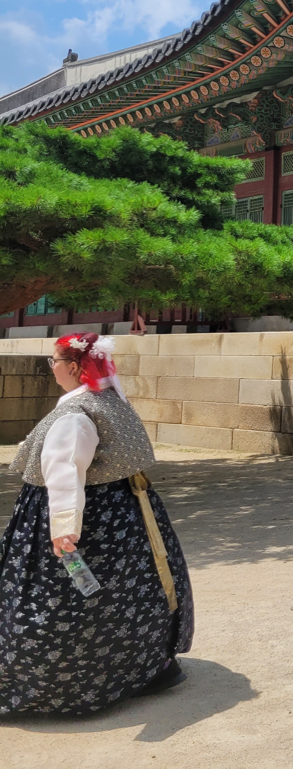 There are many layers in Hanbok, so the Hanbok rental stores help you to get dressed. There are under-trousers, and under-shirts, and over-jackets, and over-skirts. I did not rent Hanbok on that visit, as the prospect of marching around in many layers in the heat was not appealing. (You know, I am not sure if I have ever worn anything floor-length in my entire life. I think not.)
