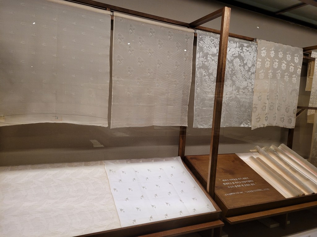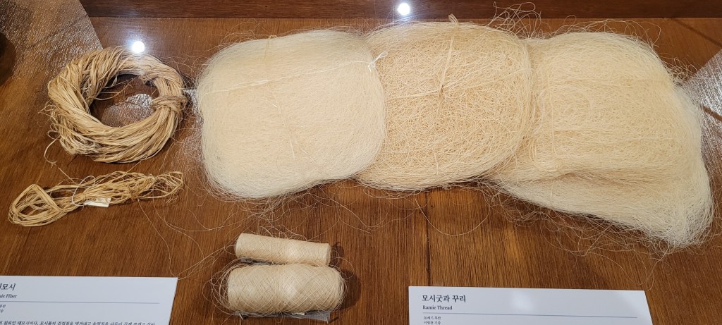 There is a long history of making textiles in Korea from indigenous plants: Silk, Cotton, Ramie, and Hemp. Each produces a thread in this White-Beige-Snickerdoodle family. Here is Ramie: