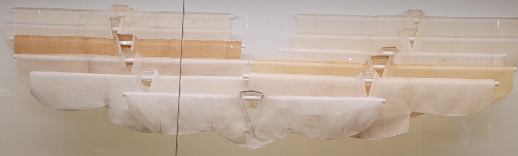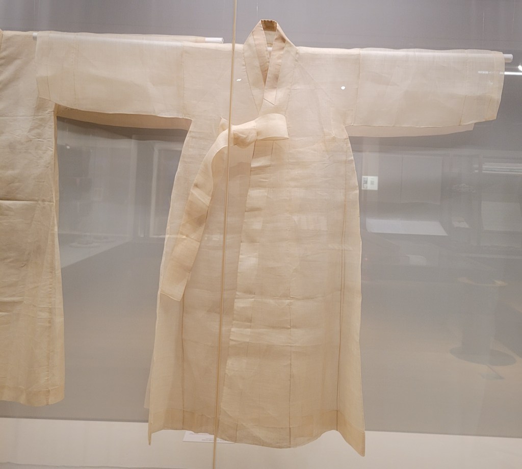 You can see the natural shades, above, of raw Cotton, raw Silk, and raw Hemp. Clothes in colors “given by nature” are construed as exhibiting Confucian-aligned values of frugality, elegance, and honorable simplicity. Even when less-hierarchical Buddhist values became prevalent over Confucian ones in Korean society, the valuing of honorable simplicity and humility continued.