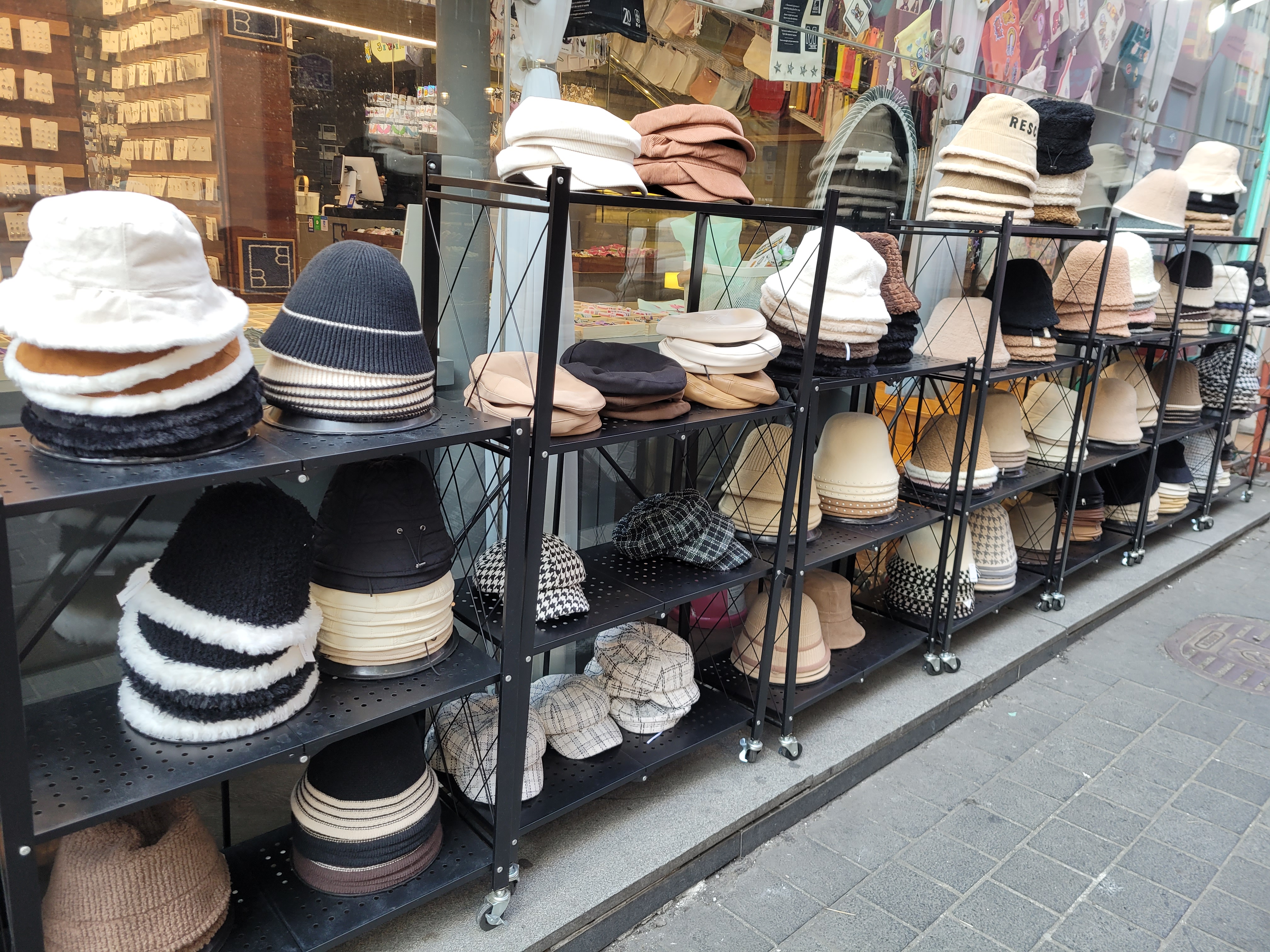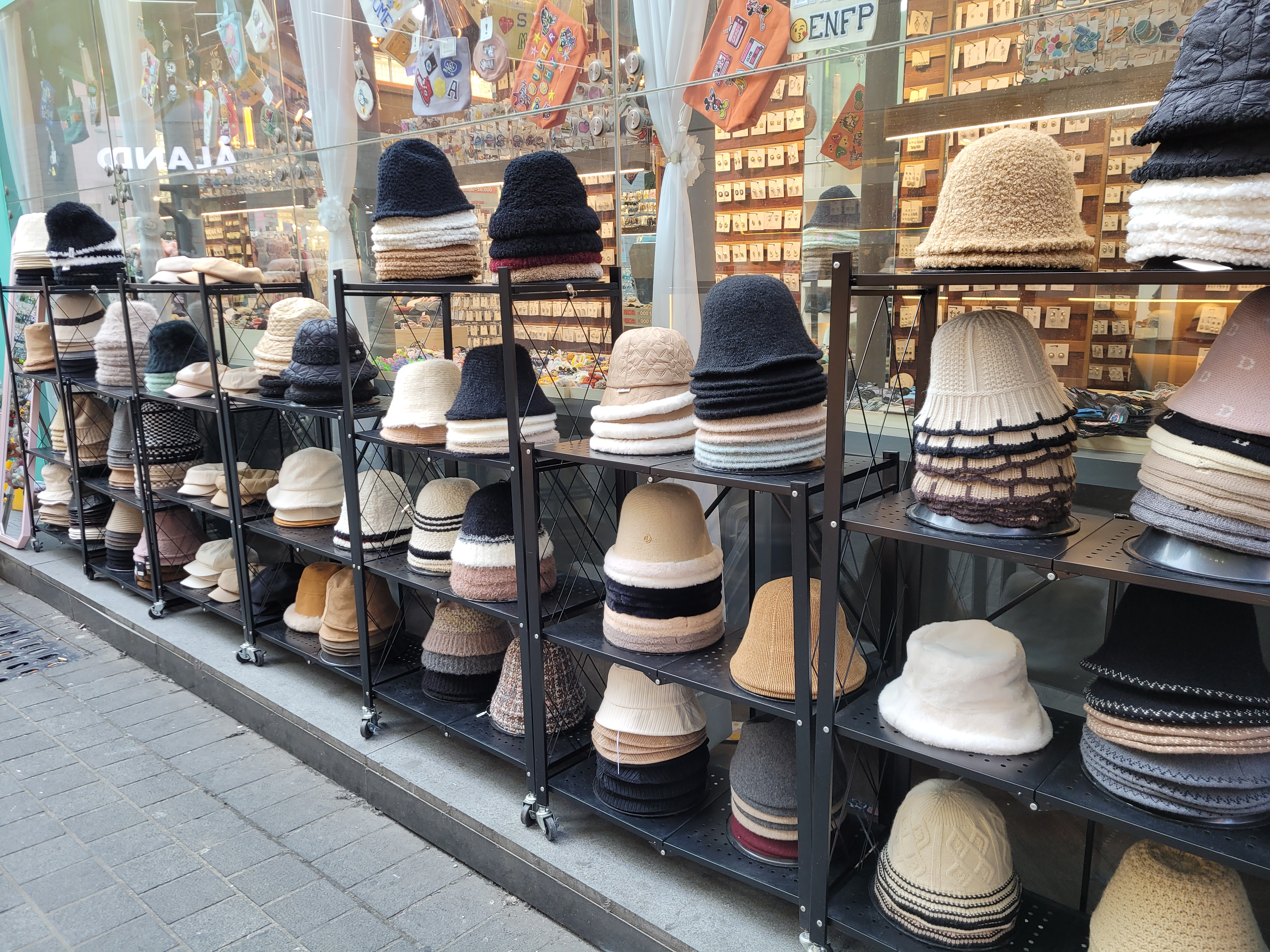 So yesterday I went to the neighborhood of Myeongdong, a popular, very busy, very trendy fashion and beauty shopping district. And you want to know what is WAY IN for winter fashion? Bucket hats. Bucket hats are HUGE at the moment!
