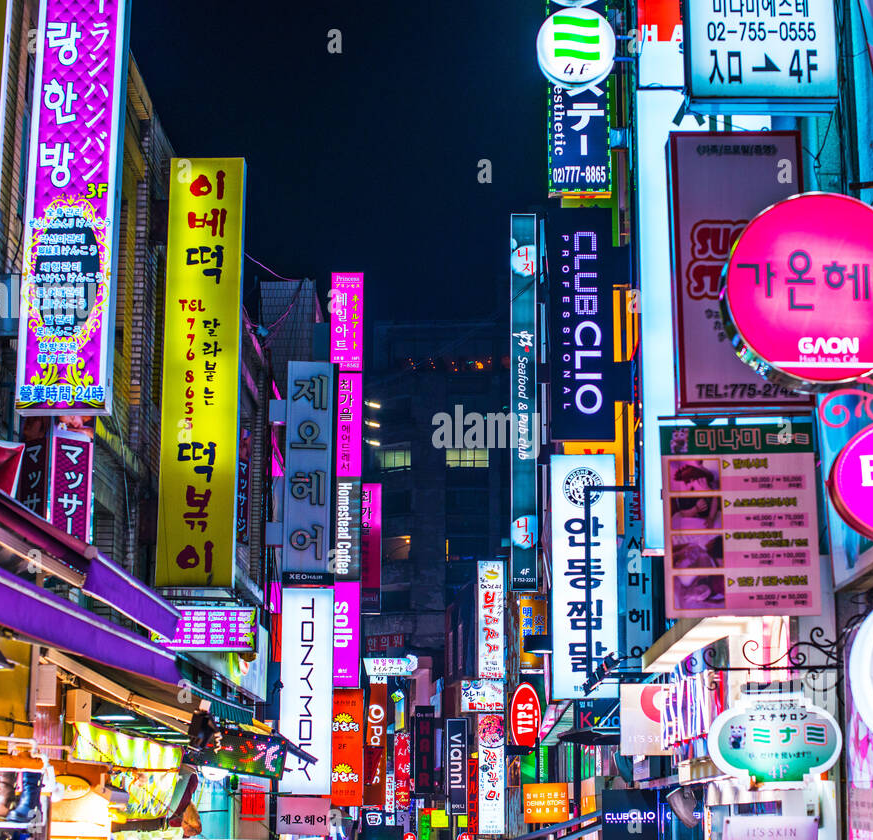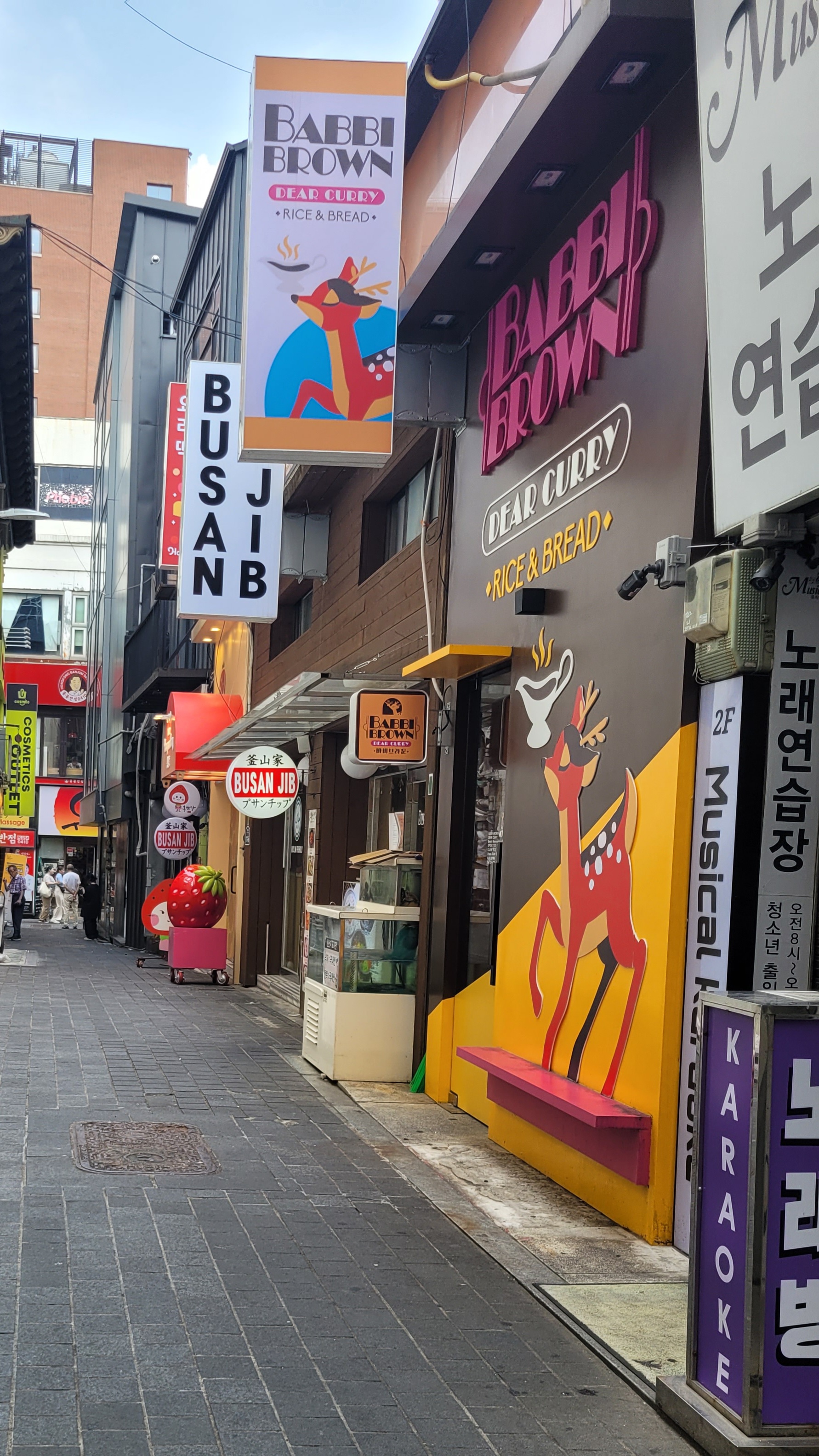 Music wafts from everywhere. A man on the sidewalk prepares to sing, accompanying himself on a small keyboard. There is K-rap coming out of this clothing shop, and K-pop coming out of that one. There are bigger fashion stores on some corners with giant glass windows and decorative displays, and large outlet shops for buying popular snacks in bulk.