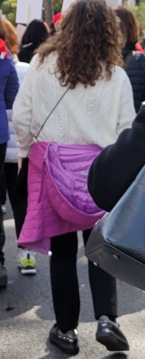 The organizers wanted a highly visible Fuchsia Wave to happen, so many of the marchers were decked out in pink clothes, scarves, ribbons, hats, banners, bandanas, or had pink messages and symbols drawn on their face or body.