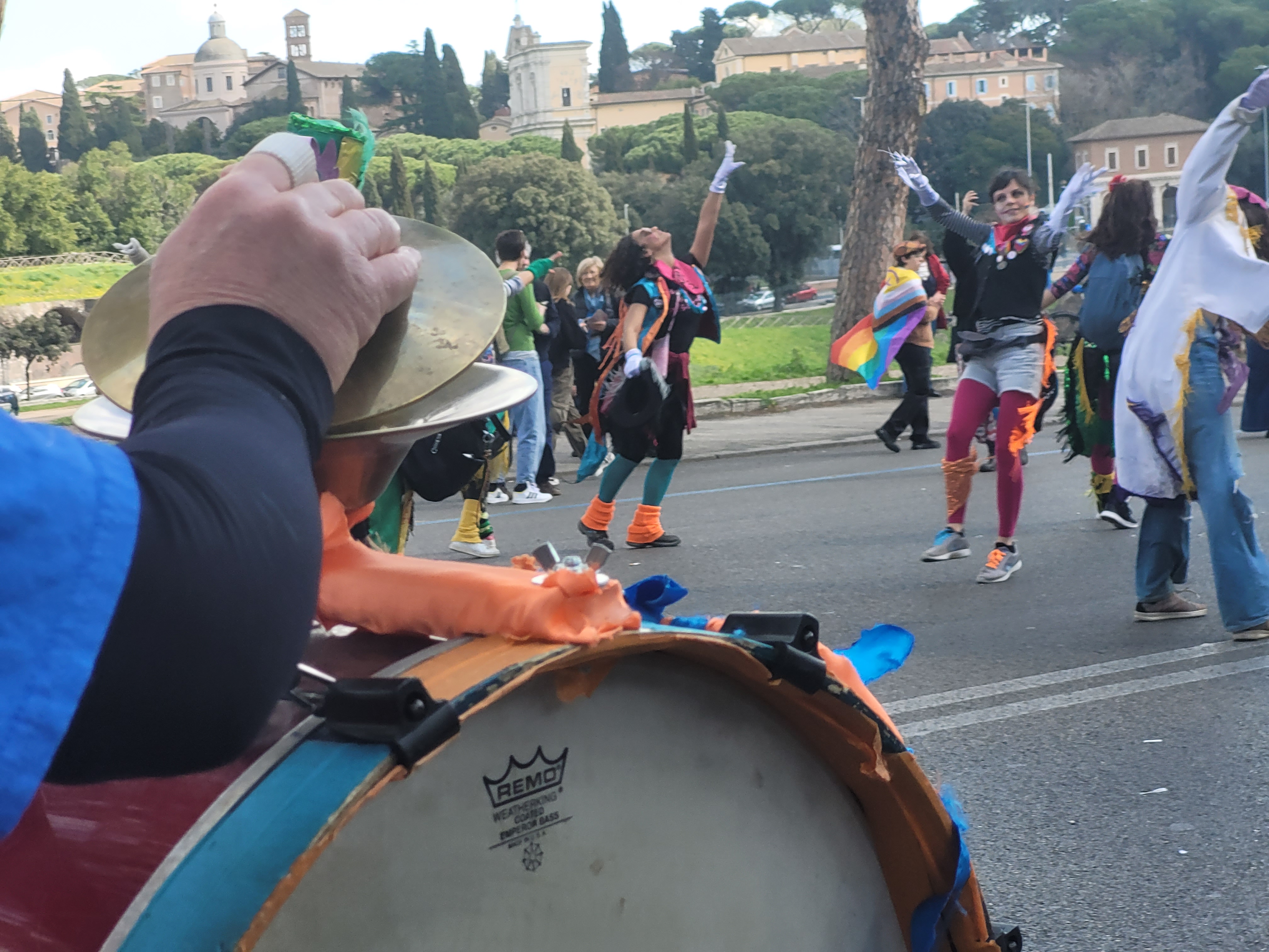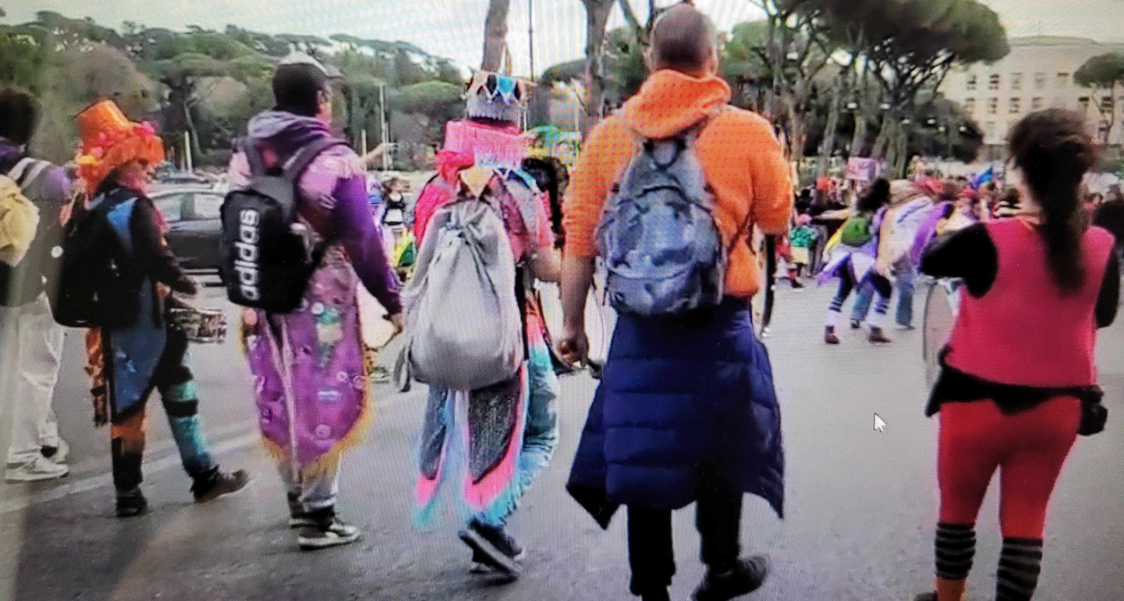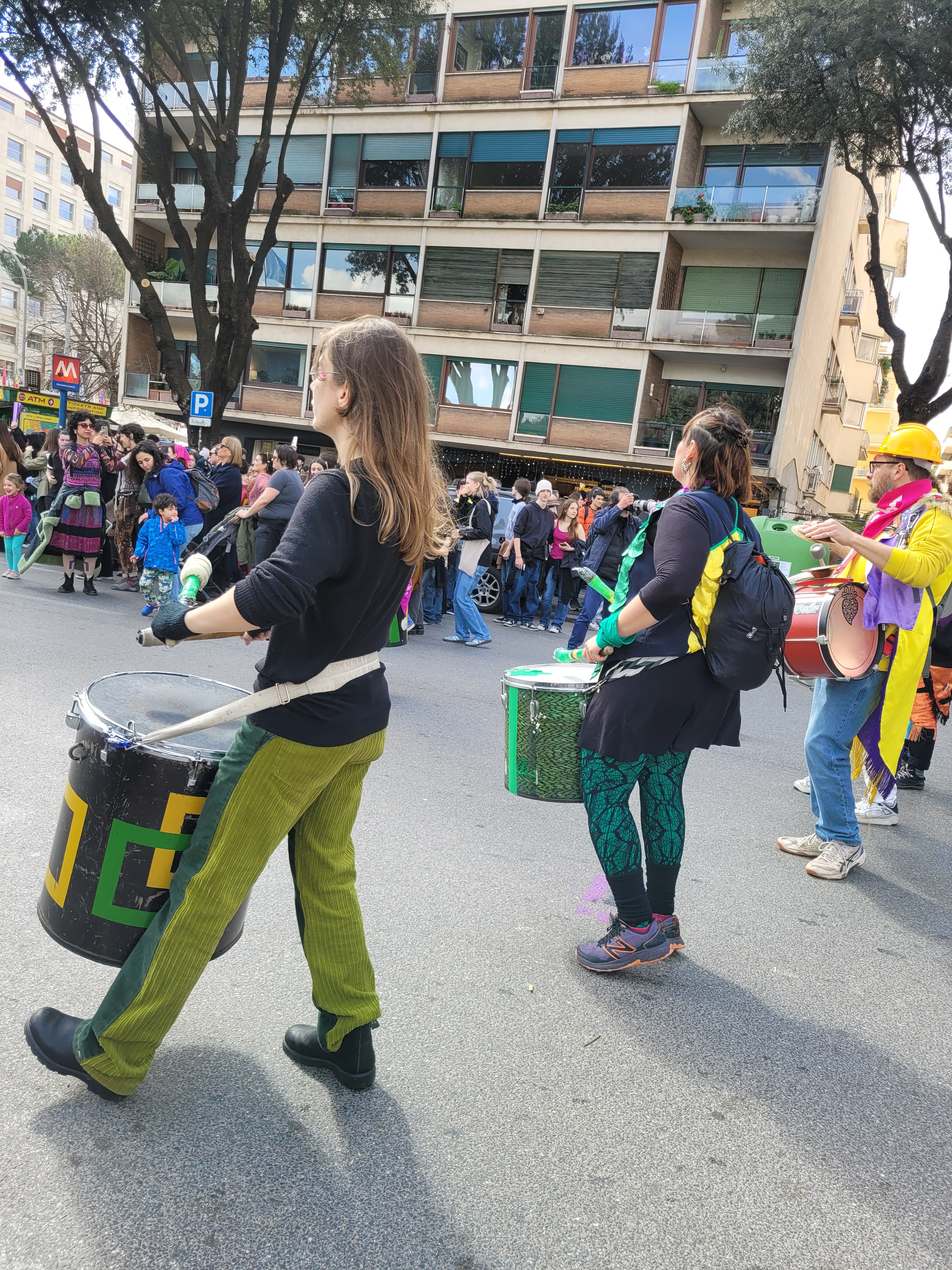The assembling took a long time, although there was music and dancing while we waited, but eventually the march began to move, heading very slowly down wide avenues, through neighborhoods, across the River Tiber / Tevere, and eventually to Trastevere, led by a truck blasting music, and a huge banner announcing that this was a “Strike Against Patriarchal Violence.”