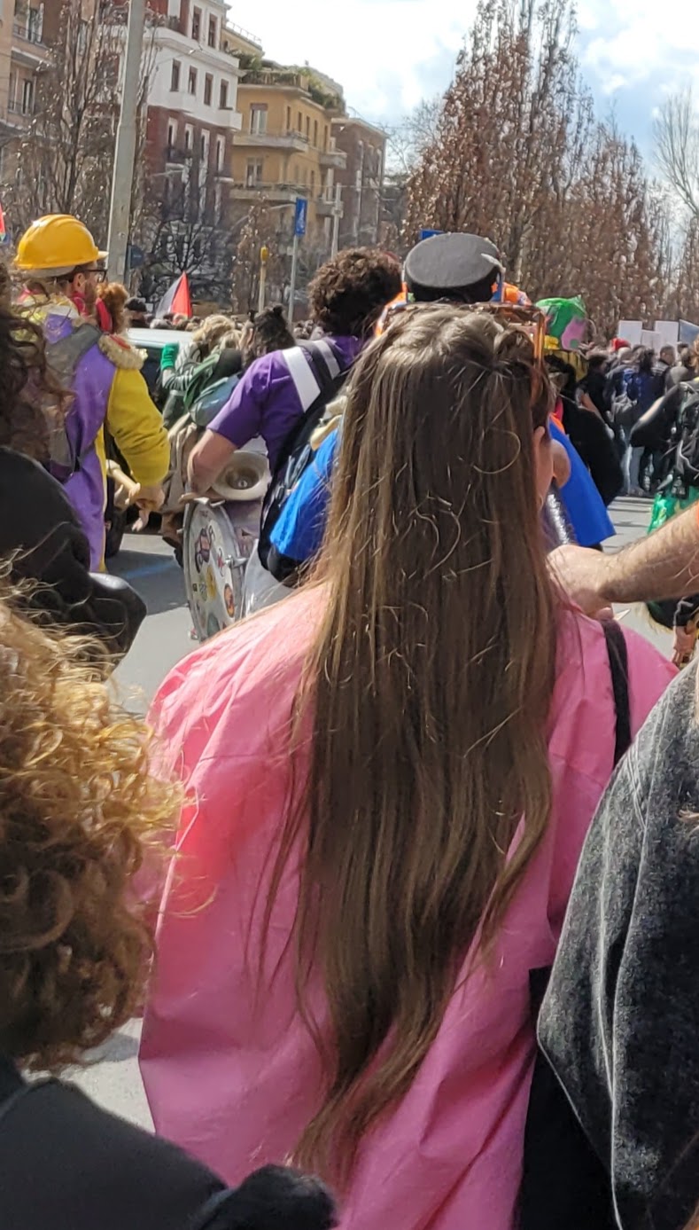 As we marched, I chatted with some Italian women wearing fuchsia shirts, about the significance to them of pink, and they said it was a strong, unifying color, and one that worked well symbolically for Women’s Day, making pink represent not just femininity but also feminism.
