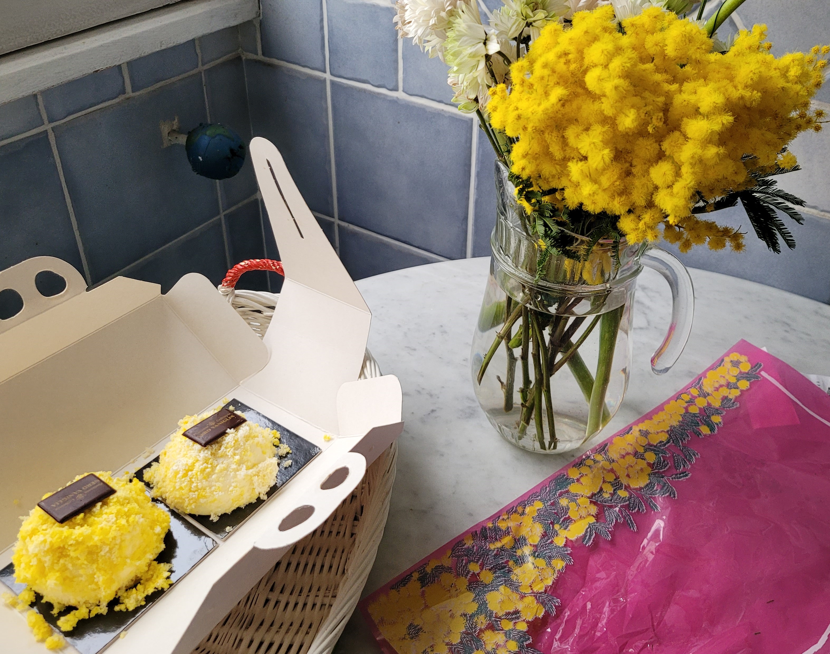 That’s two small Mimosa Cakes, and a bunch of yellow Mimosa Flowers, right there in my Garbatella kitchen.