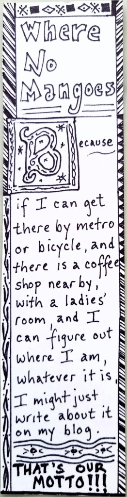 You can now interactively make yourself some Official Where No Mangoes Bookmarks. I have provided below some original bookmark artwork, which you can download and print onto cardstock/heavy paper, or onto regular paper which you then attach to some cardstock.