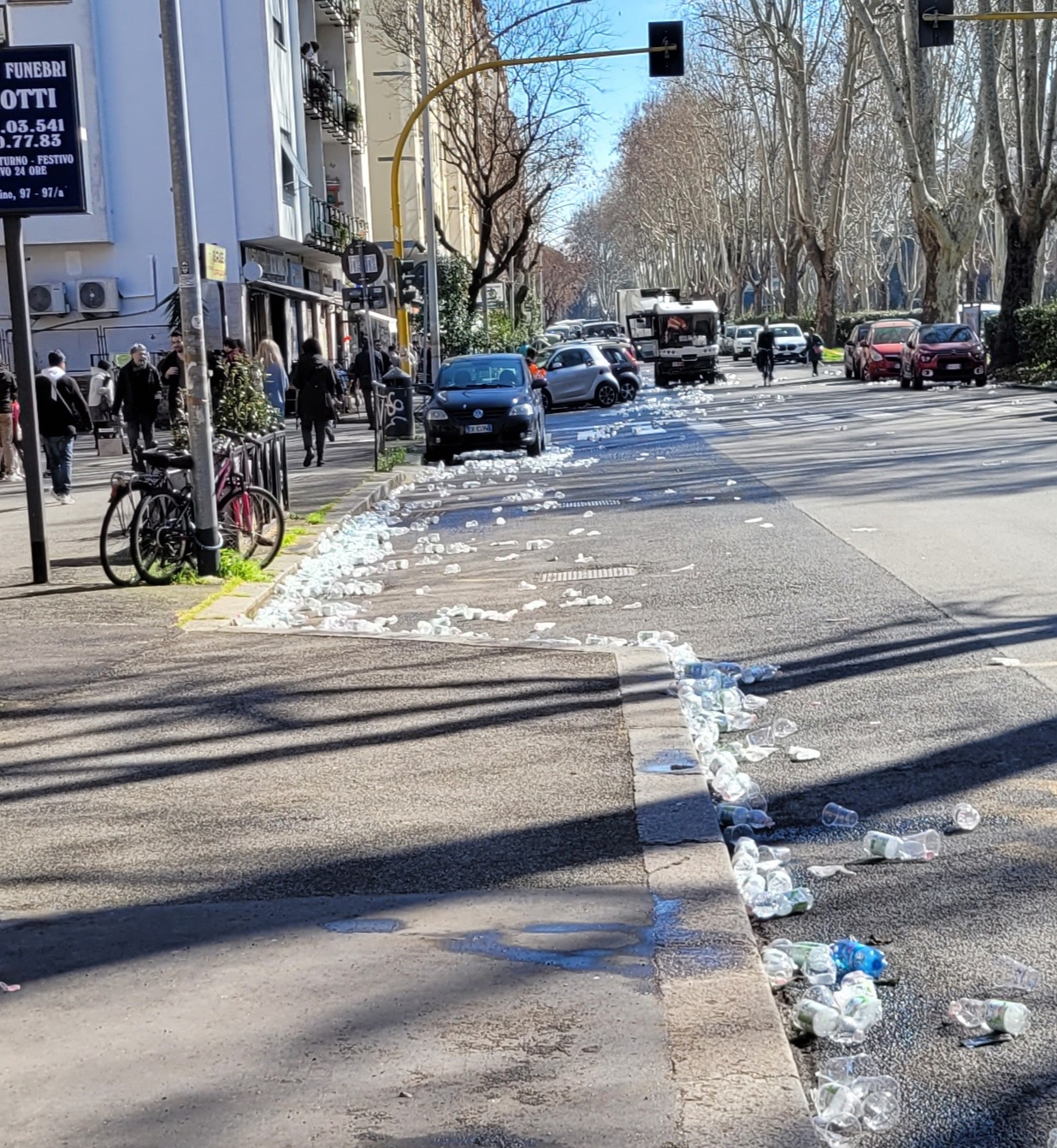I cleared the nearby walkways, sweeping the bottles into neat curbside piles for the garbage trucks to collect. Then, feeling utterly heroic, I leaned my broom against a wall and bought myself a nice soy cappuccino at Bar Mimmo, and chatted with Francesco, the barman, all about spazzatura.