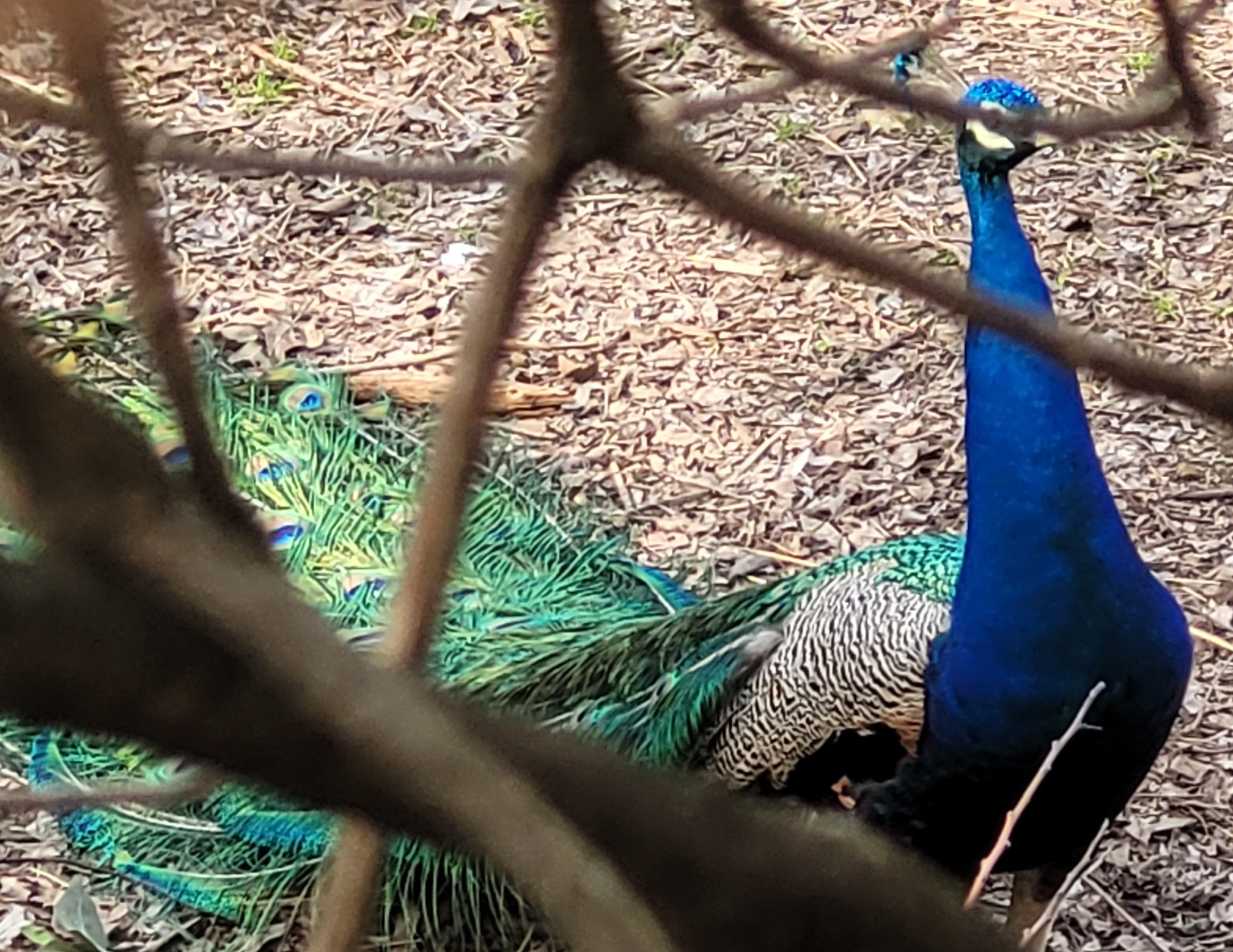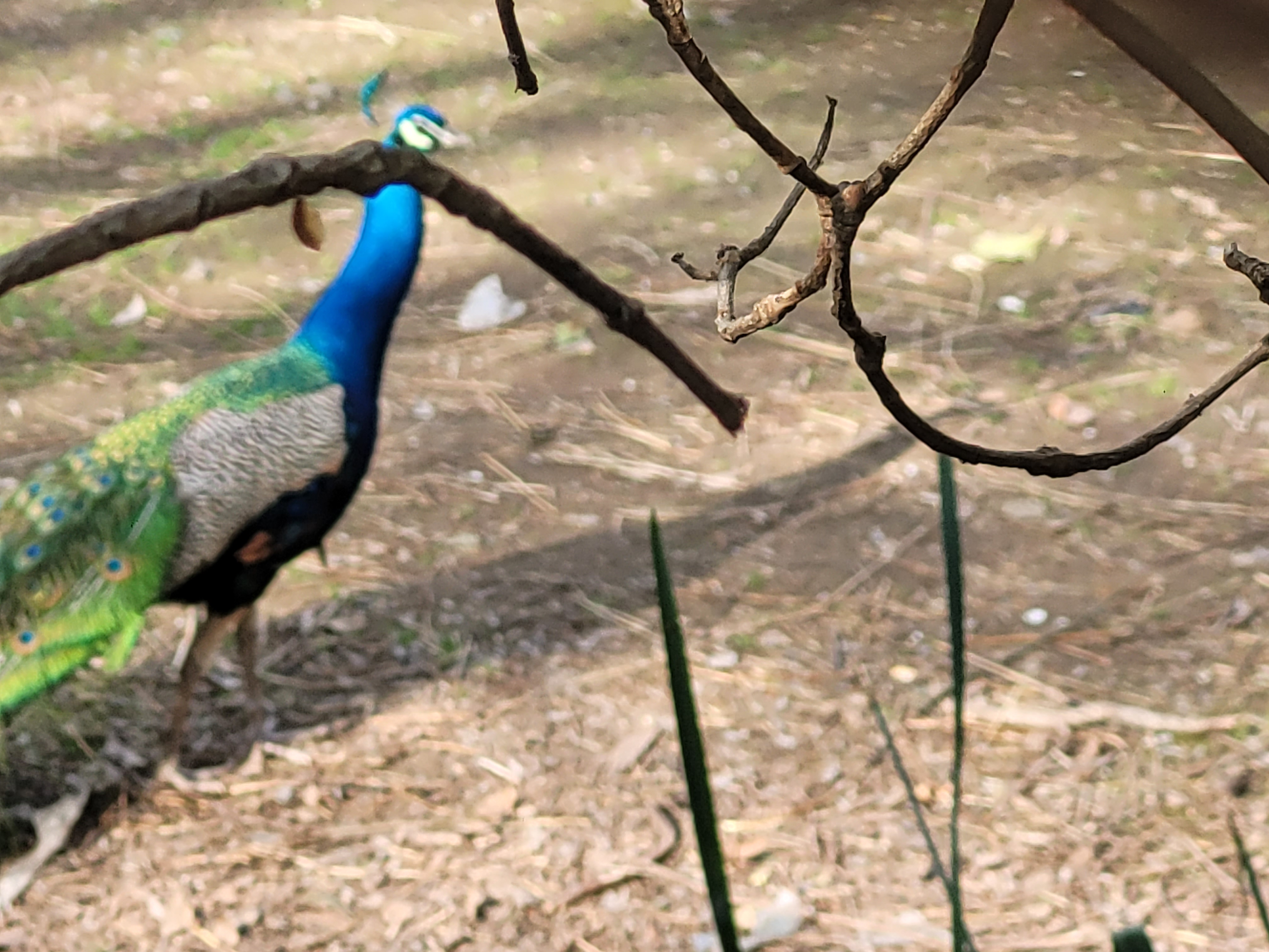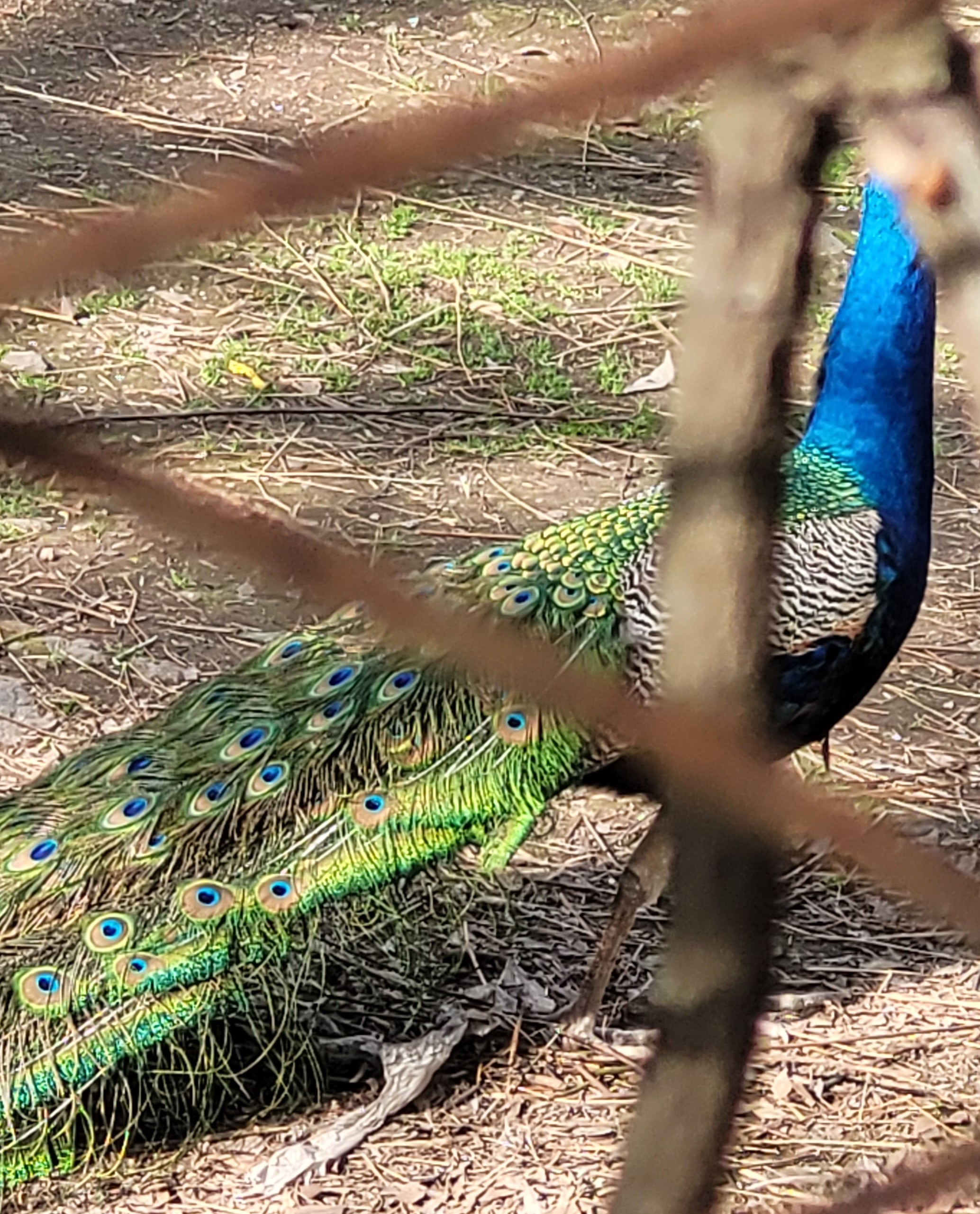 But that peacock, man. It took several visits to get a picture of the elusive peacock. At first I could only hear him, but then began to get glimpses. That peacock is not into being photographed at all.
