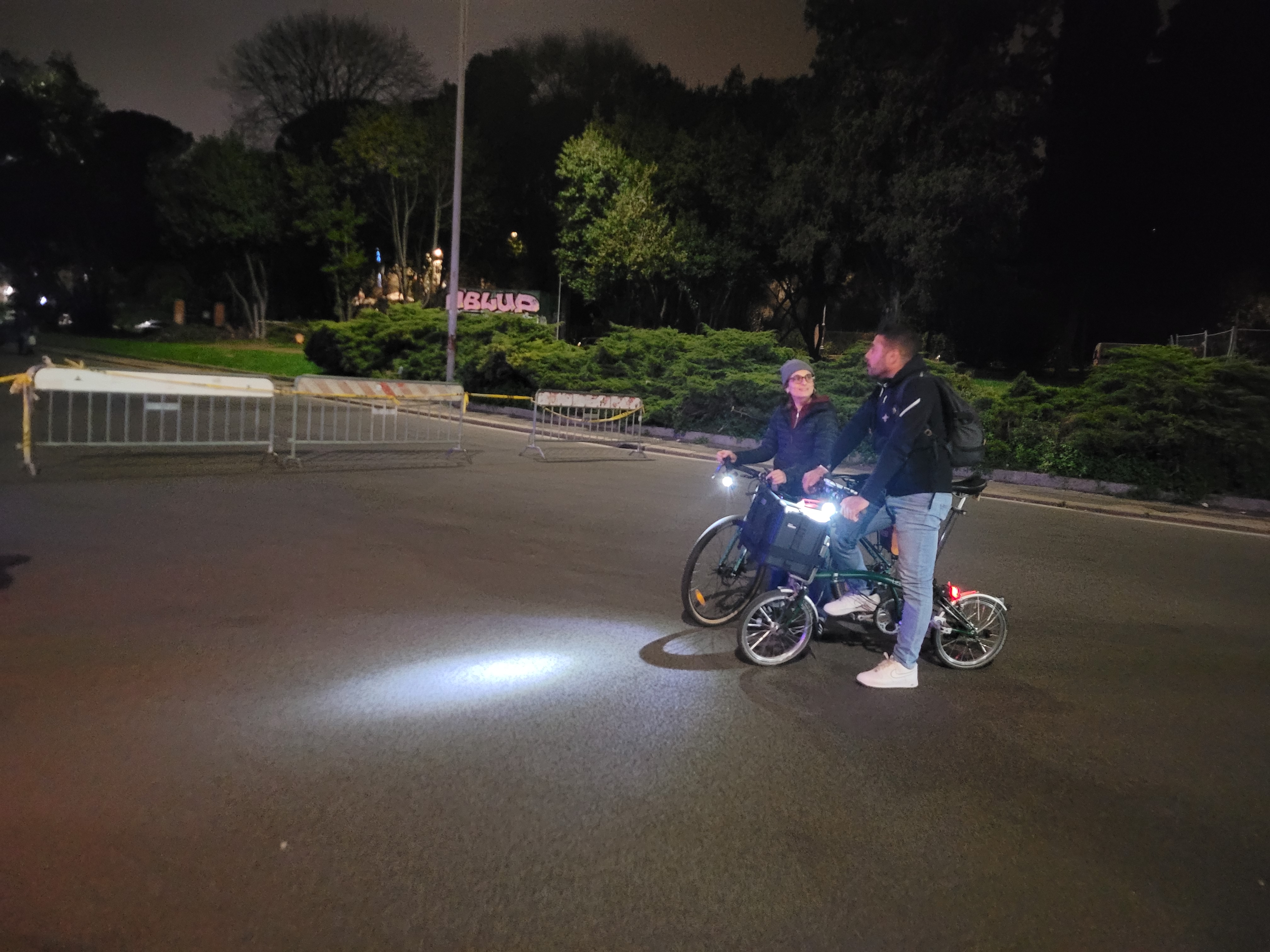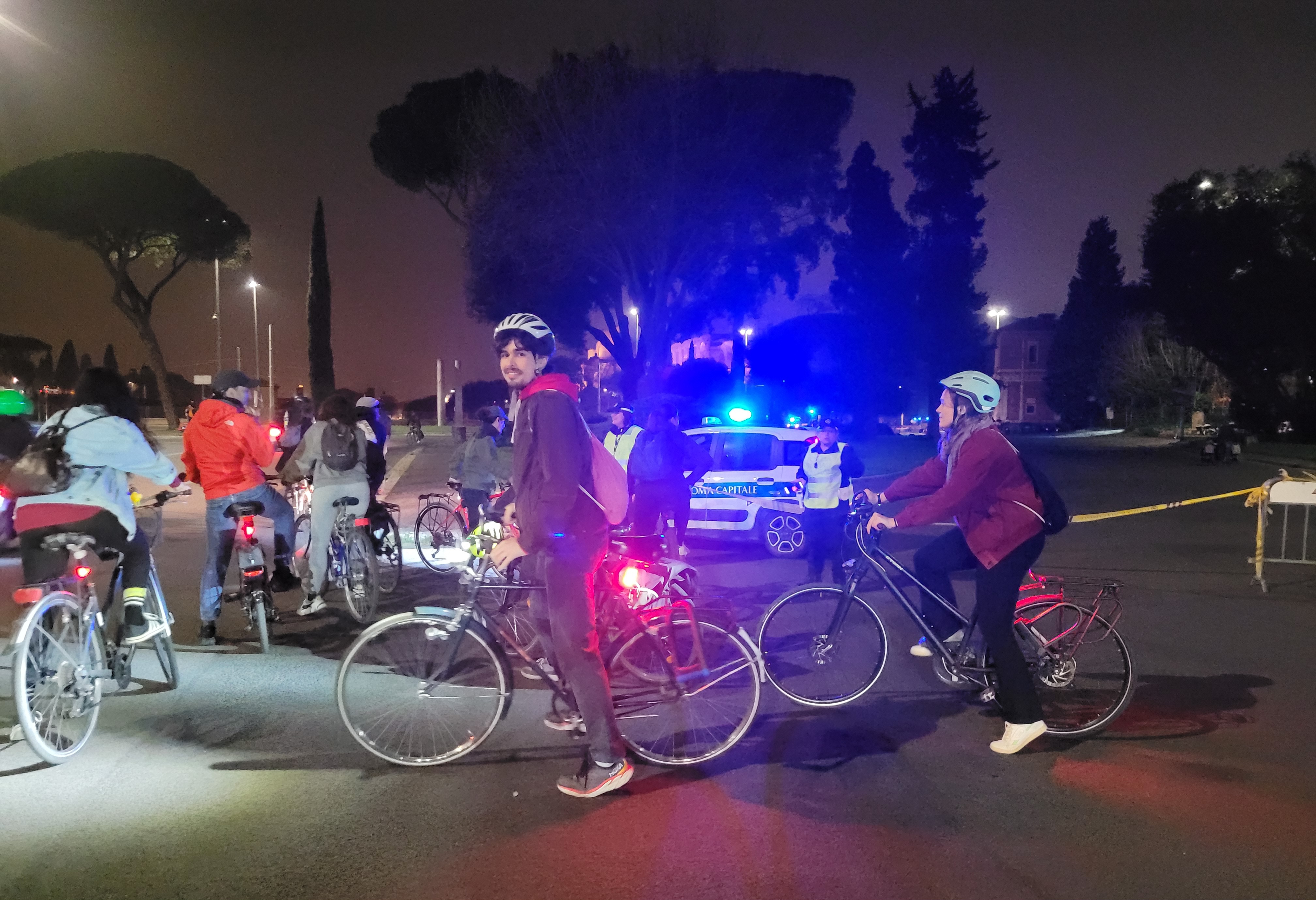 The monthly Critical Mass bicycle ride in Rome is part of a global effort to reclaim streets from cars, so masses of riders mass together (here in Rome on the last Friday night of each month) and go for a nice slow cruise together.