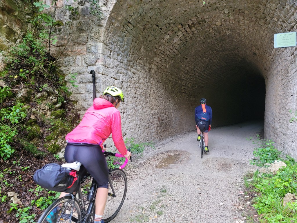 Day 2 was a longer bike ride to Norcia. The route was a long, straight climb comprising highway, gravel bike path, modern highway tunnels, and some unlit ex-railway tunnels on the rail-to-trail bike path.