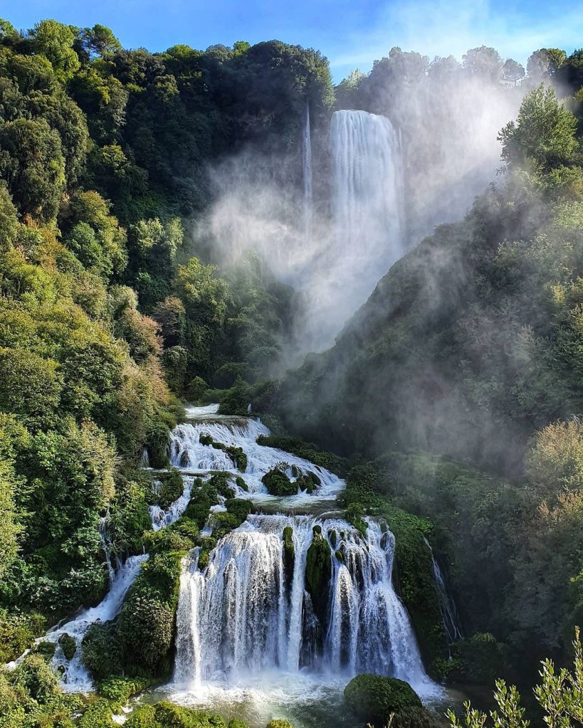 The Cascata delle Marmore, or Marmore Falls, the largest human-made waterfall in the world. The water cascades down tiers from a height of 541 feet (165 meters). It was made by the Romans in 271 BCE, a time when the Romans were building walls and fighting wars, and somehow required a giant waterfall.