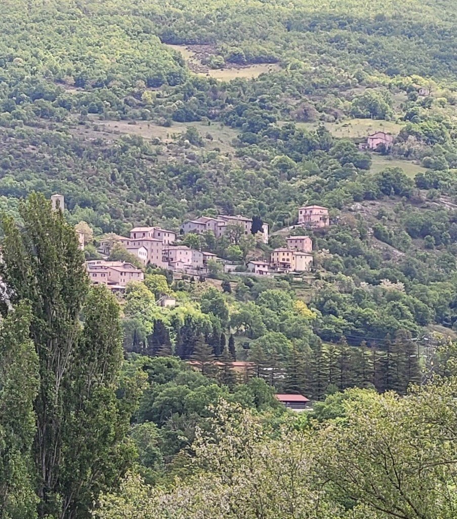 Then I started on the last part of my journey, out of San Severino and into the hills of Pitino to find my writers’ retreat location, along some streets, down some highway, around a few roundabouts, along a bit of bike path, on a country road, on another country road, up a long climb, down a hill, up a hill, and down a half-mile of gravel road to the gates …