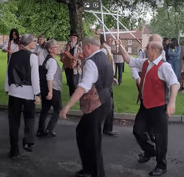 Thus begins the website of the Great Ayton Leven Sword longsword dancing troupe, a group of spirited locals who practice and tour around in the summer months, playing music and dancing with swords. Leven Sword | Visit Great Ayton, North Yorkshire. At the end of a dance, they somehow thrust their swords into the middle of their moving circle, and someone raises them, now woven into a solid sword design, usually a 6-pointed star.