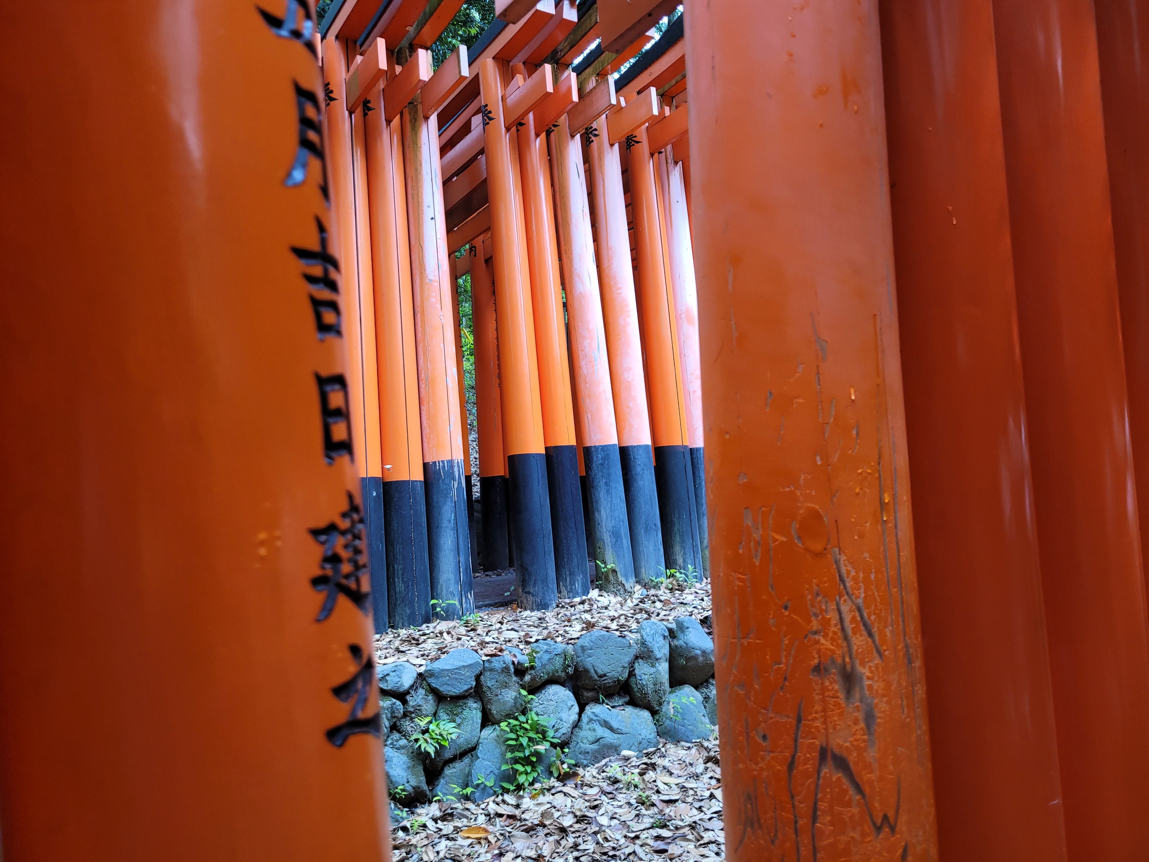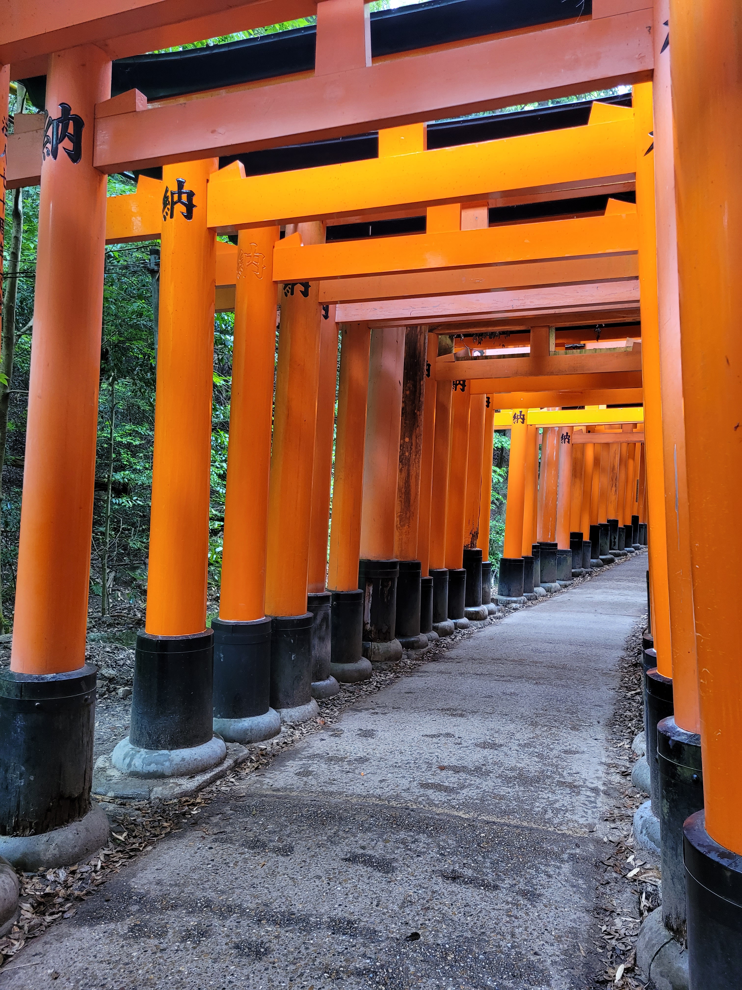 The arches or gates are called torii, specifically Senbon torii (千本鳥居), or “thousand torii.” There are thousands of orange gates lining the looping path up to the various temples, and then back down the mountain.