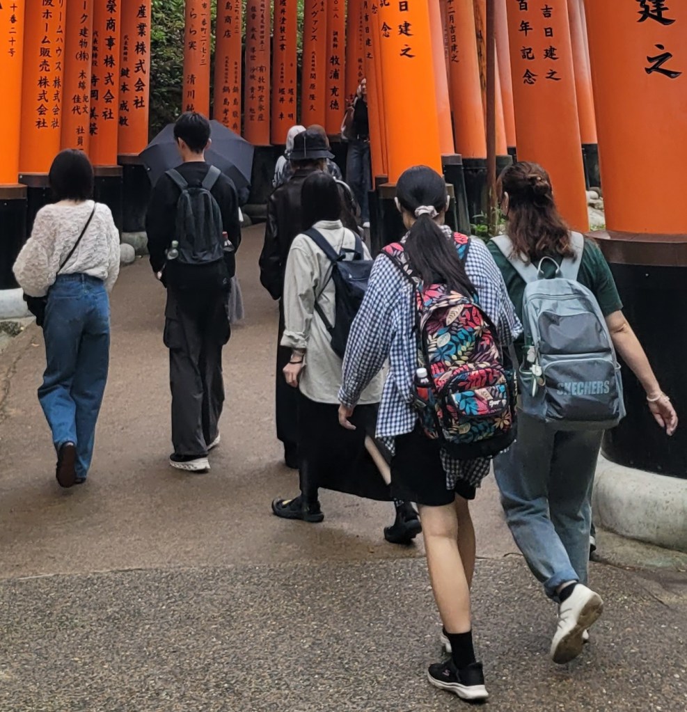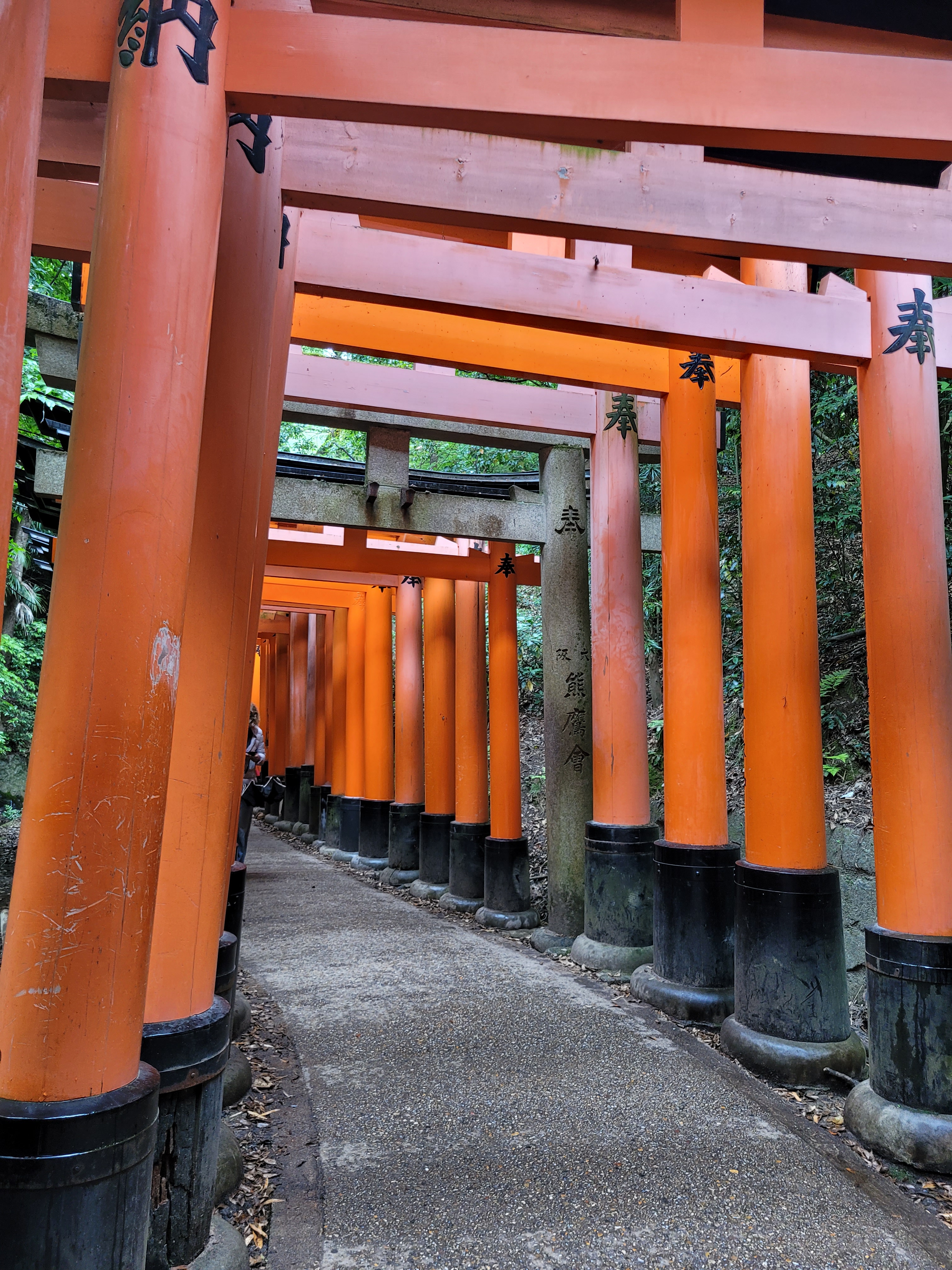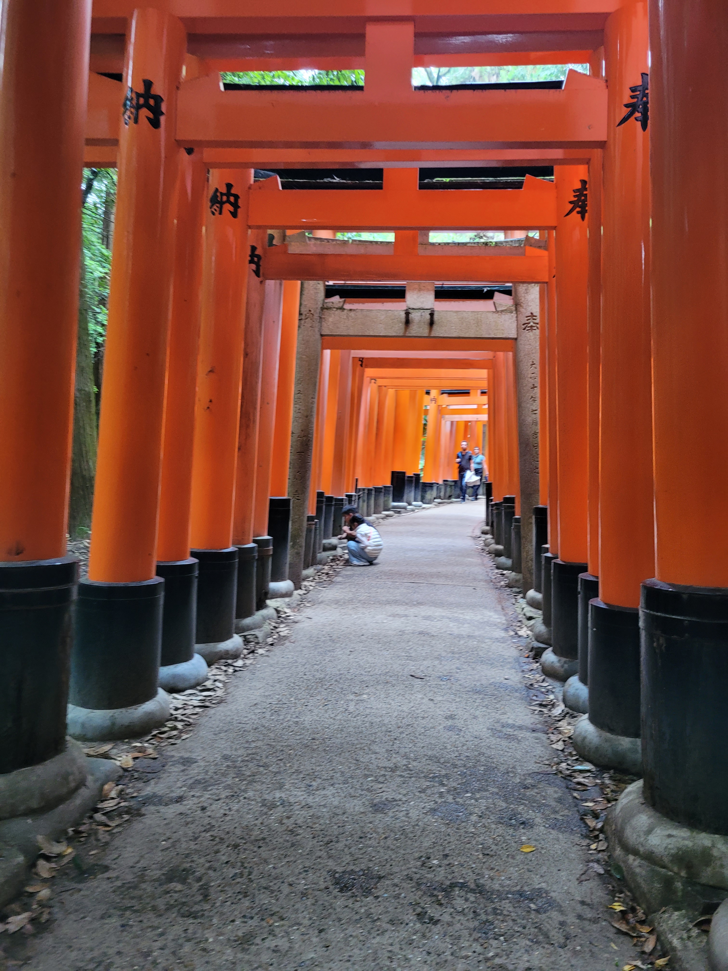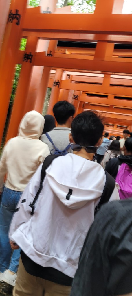 The drizzle and breeze deterred no one. So we all marched up the mountain through the tunnels of vermillion gates, each arch donated by someone inspired through the centuries by this venerable network of temples and shrines dedicated to Rice.