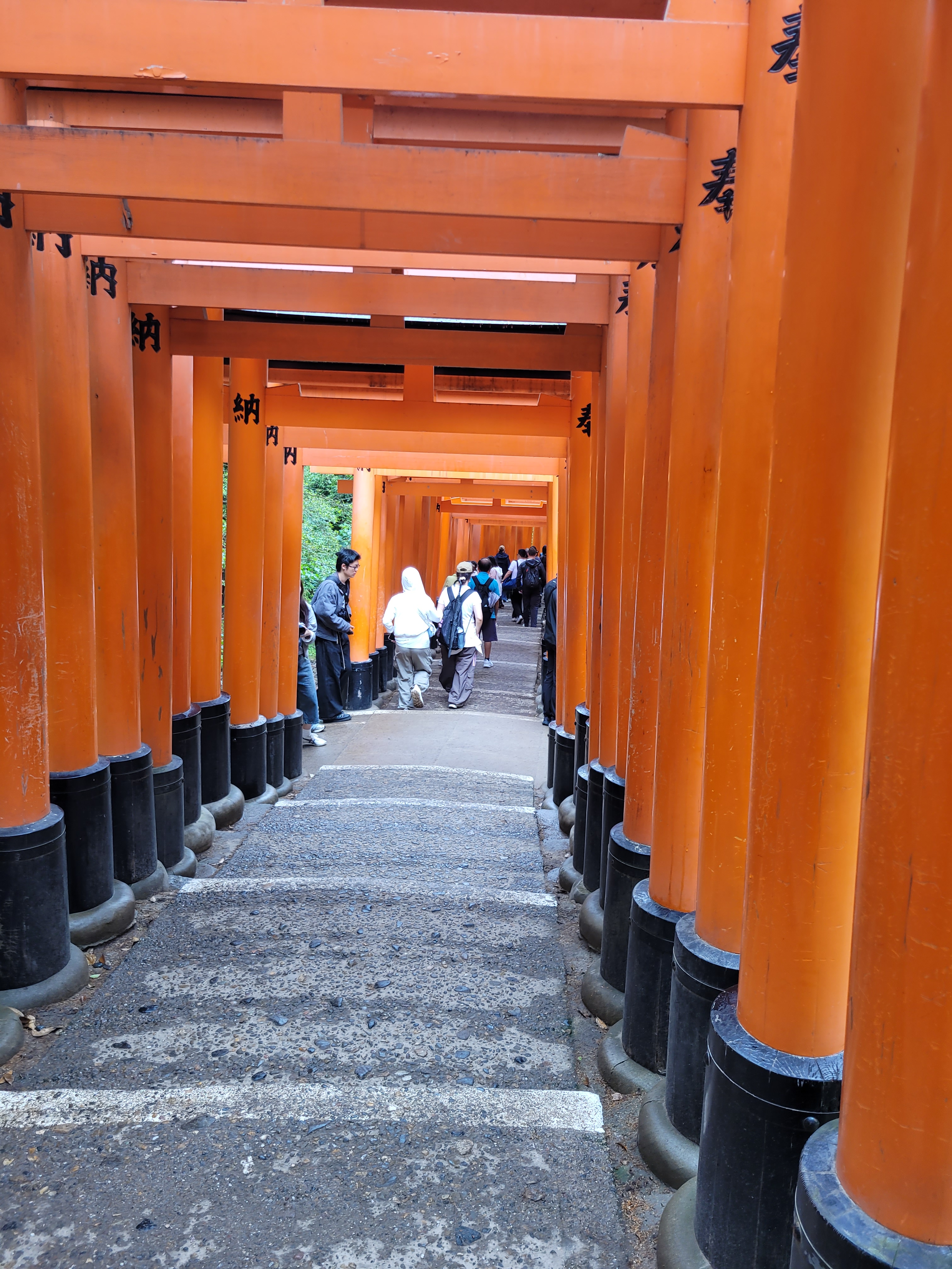 Eventually the crowd thinned out — many people were stopping along the way to take photos of each other posed against the brilliant orange pillars, which required them to wait for crowds to pass. I very happily kept stomping along, up and up.