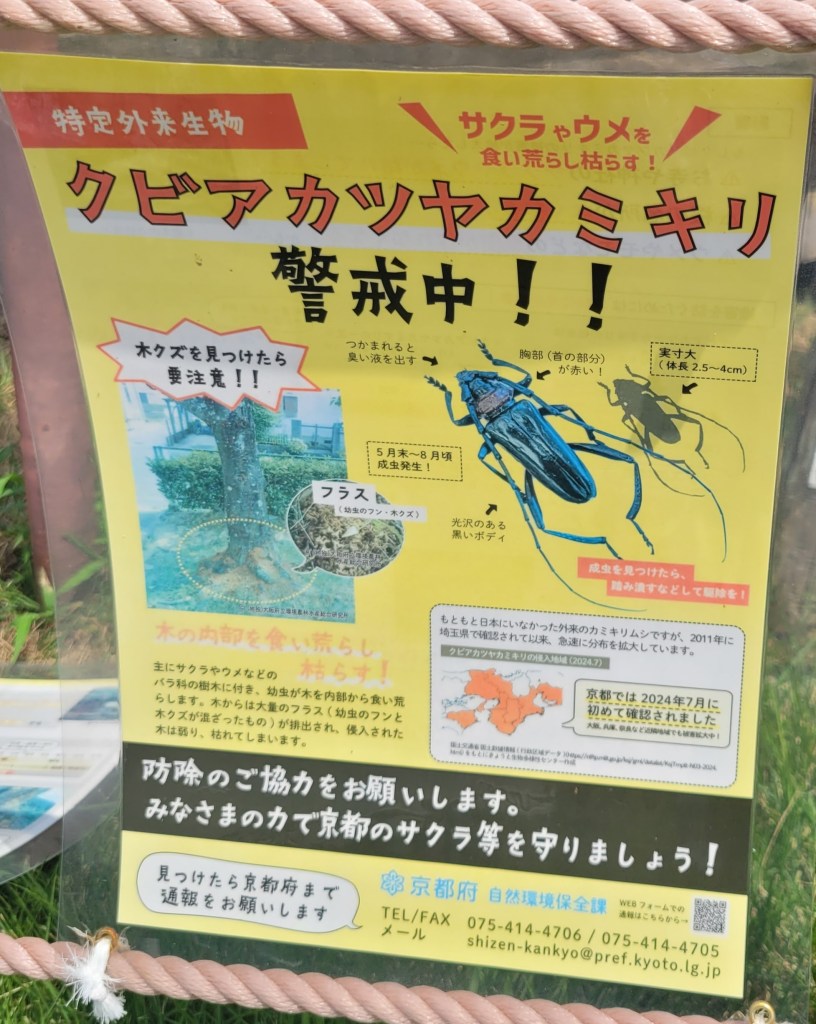 You could, for instance, think about the red-necked longhorn beetle, an invasive bug species that has arrived in the prefecture of Kyoto.
