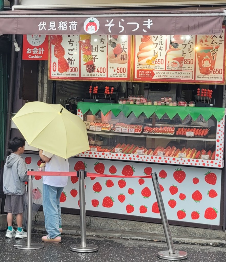 I found sugar-encased fruit on a stick here in Kyoto! I first encountered this culinary wonder in Seoul, South Korea. I have not tried Japanese fruit on a stick yet, but I now have located a source. I shall continue to investigate.