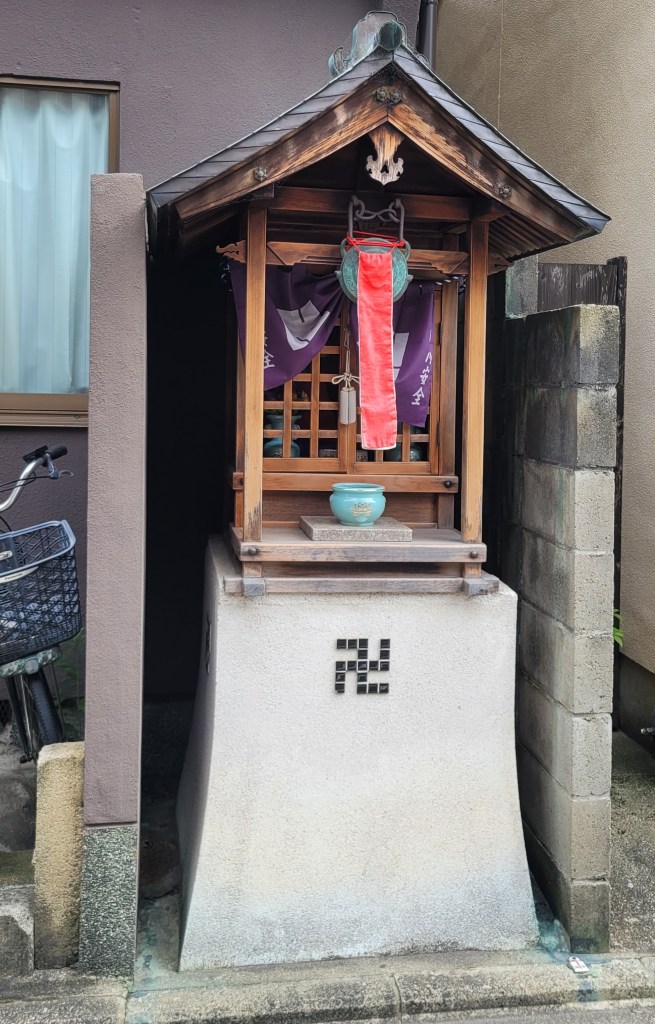 Many houses in Japan have small shrines outside them. This is a Buddhist shrine, and the symbol at the bottom is Buddhist, a left-facing swastika (that word comes from Sanskrit) called a “manji” in Japan. The manji is a symbol of the Buddha’s footsteps and shows up in Buddhist art and architecture. The same symbol is also used in Hinduism, with several sacred associations. (The Nazis, appropriating the symbol, tilted theirs 45 degrees.)