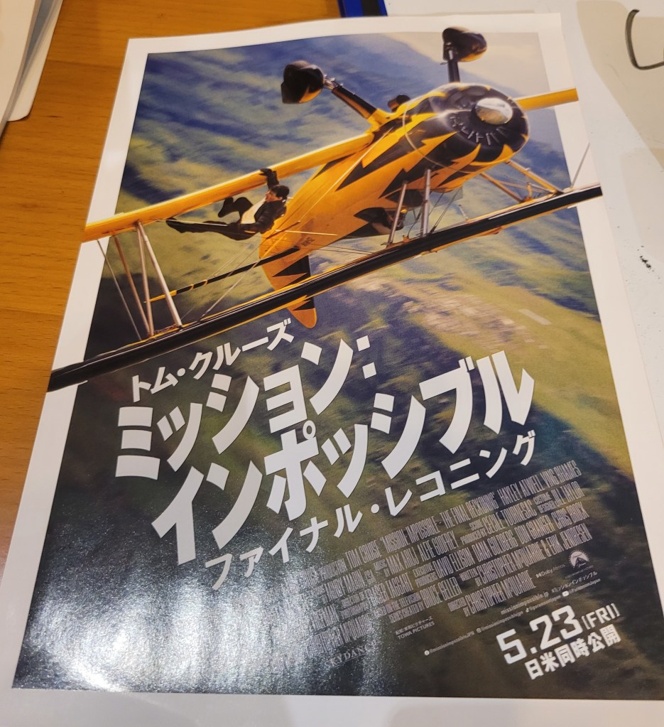 At my very first Japanese class here in Kyoto, the teacher wanted us to discuss “hobbies” so she shared that one of hers is going to the cinema, and she’d just seen the newest Mission Impossible blockbuster, because she loves Tom Cruise. I mean, absolutely loves him. So we spent a wonderfully fun large chunk of class discussing Tom Cruise in Japanese, and we each got to take home a movie poster.