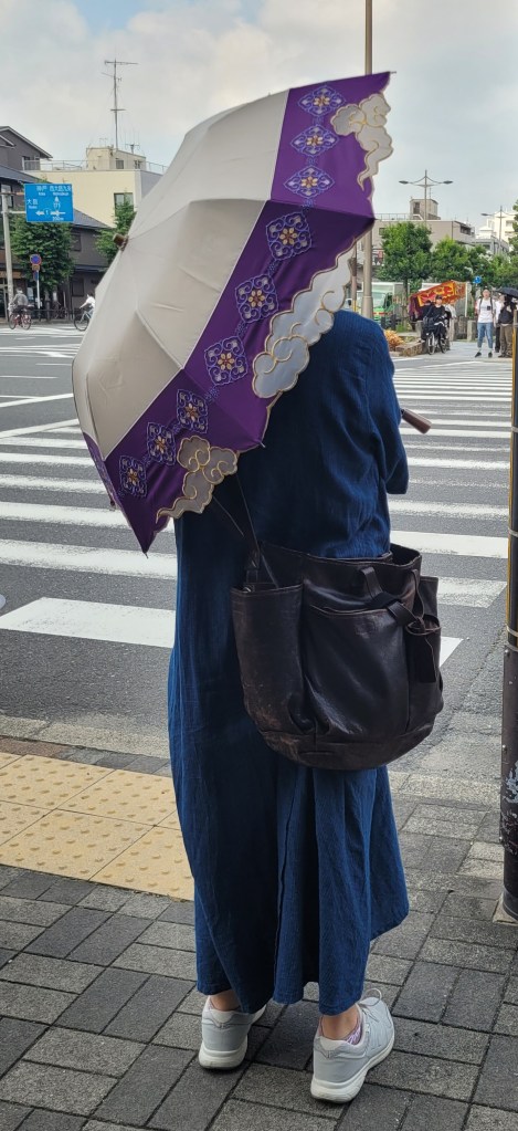It is very hot and humid here now, but I thought you’d like to know how local people deal with the somewhat oppressive summertime weather: a stylish parasol! And loose baggy clothes, and comfortable shoes.