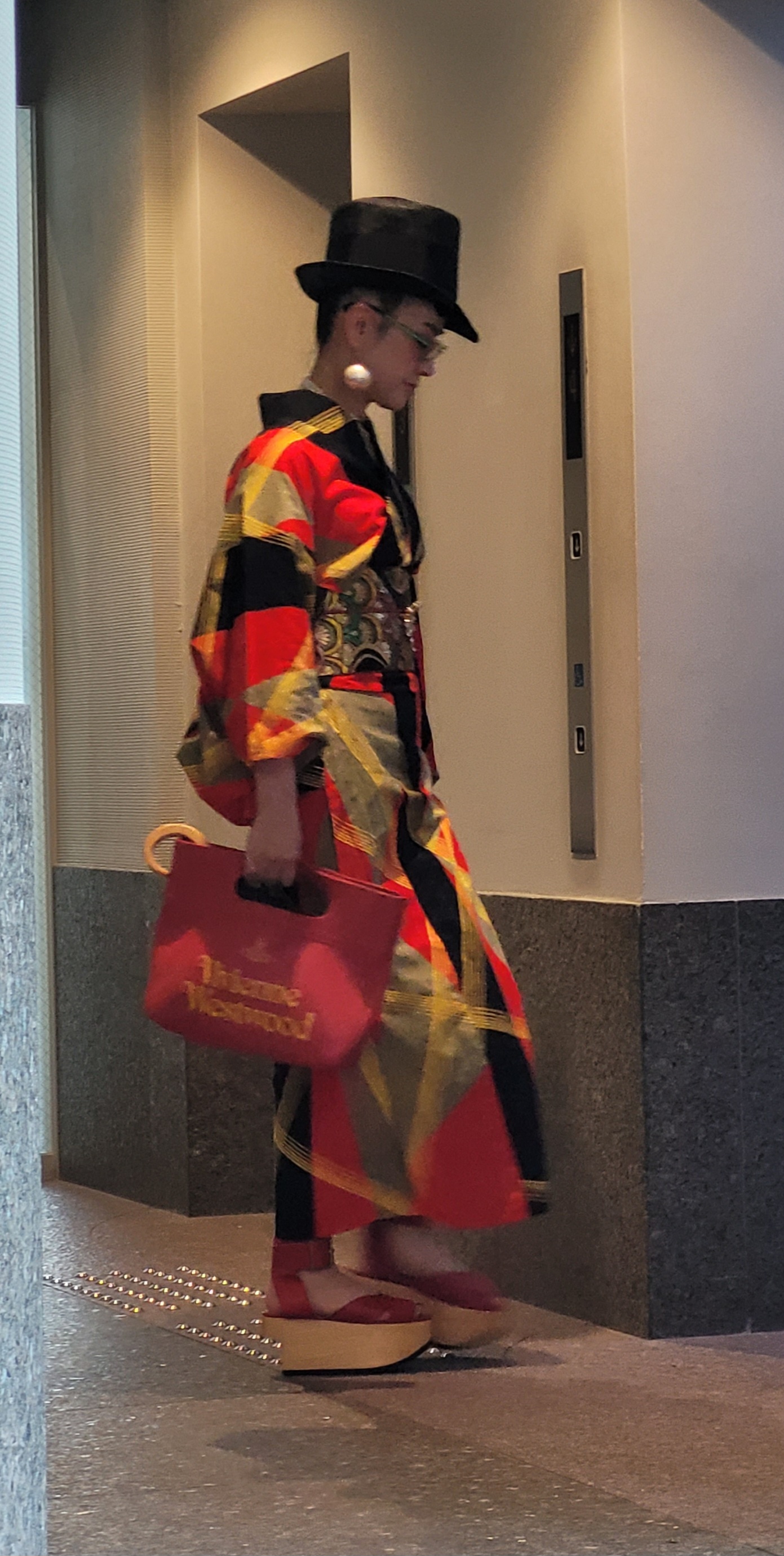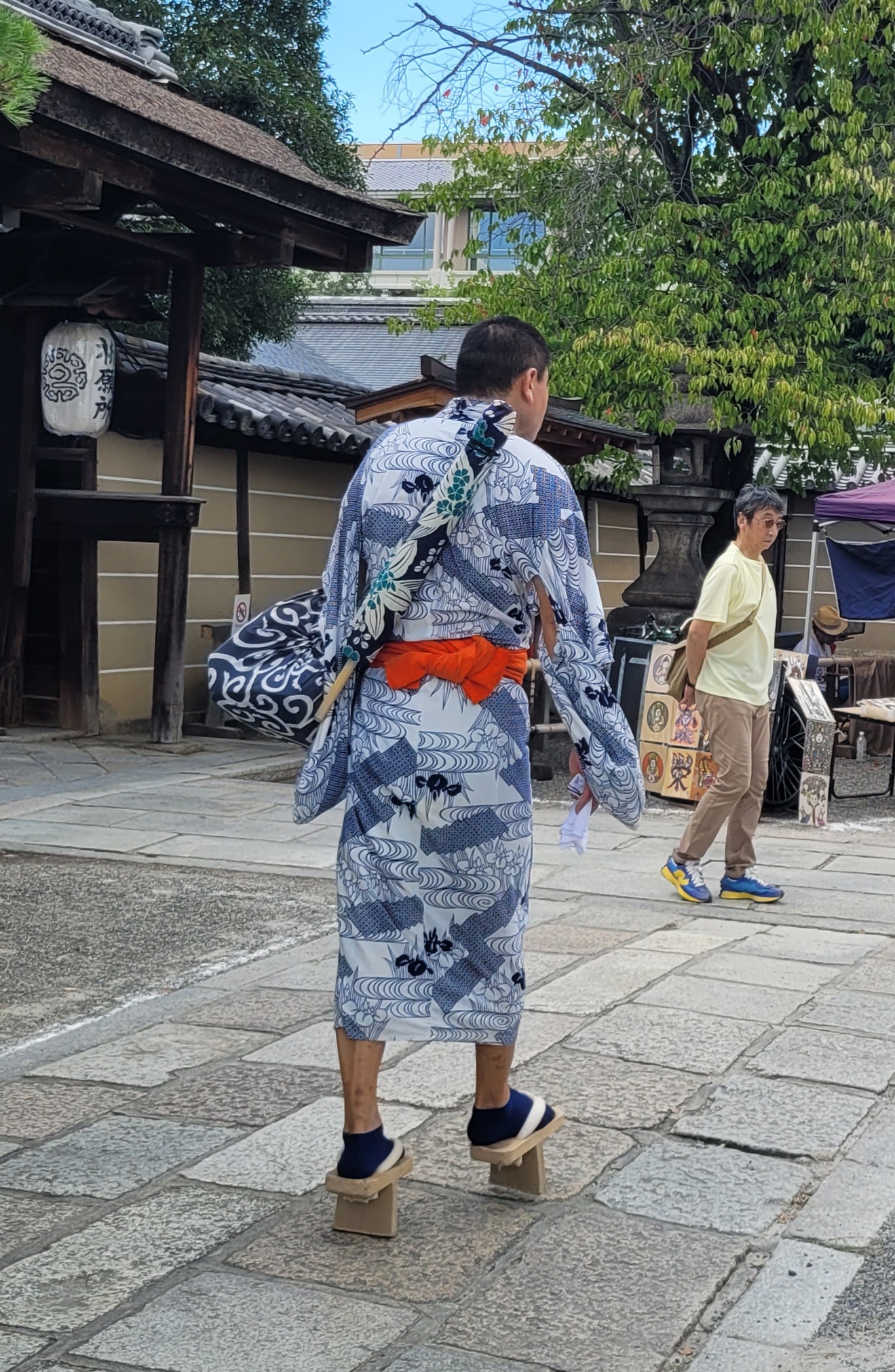 These are my “This week’s Kyoto fashion icons!” Many Japanese people and some tourists wear traditional Japanese outfits, mainly the kimonos in the first three photos here, which are ankle-length, and the yukata in the last photo, which is less fabric and shorter. Please note the shoes! High and traditional wood-block. The top-hatted woman is the epitome of chic to me. Oddly, I saw the first three women together at a museum, and then spotted them again hours later — they were eating in a restaurant I passed by in a whole other neighborhood. But there was that distinctive top hat again.