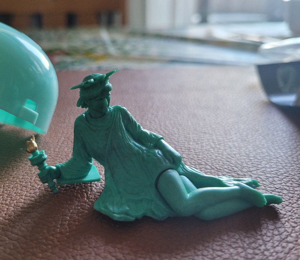 The toy is one of a set of 6 posed rubber Statue of Liberty toys, the implications of which are extremely difficult to infer, even now after I have read a 2014 blog post written about them when they first came out, and watched some stop-action YouTube videos made about them coming to life and taking over a photoshoot.