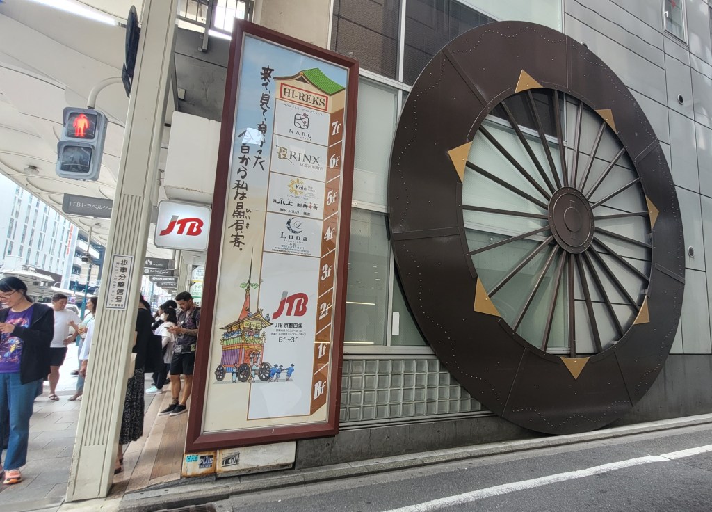 This is cool. Nonchalantly on an alley wall, a poster about the Gion Matsuri festival and a model of a giant festival float wheel.