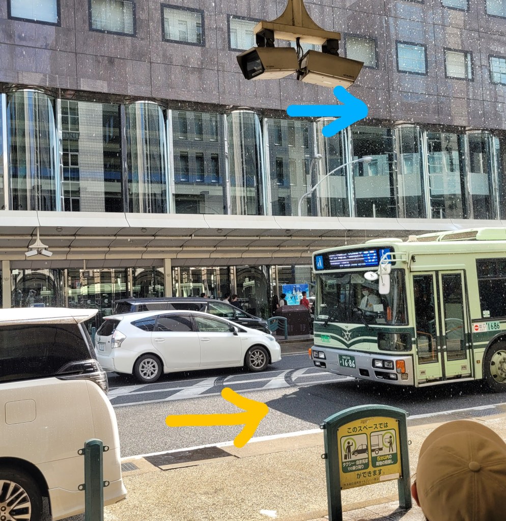 And on the topic of weather in Kyoto, this photo points out an extremely weird moment earlier today: pouring rain, a sudden heavy shower of large raindrops (blue arrow) during (yellow arrow) brilliant sunshine.
