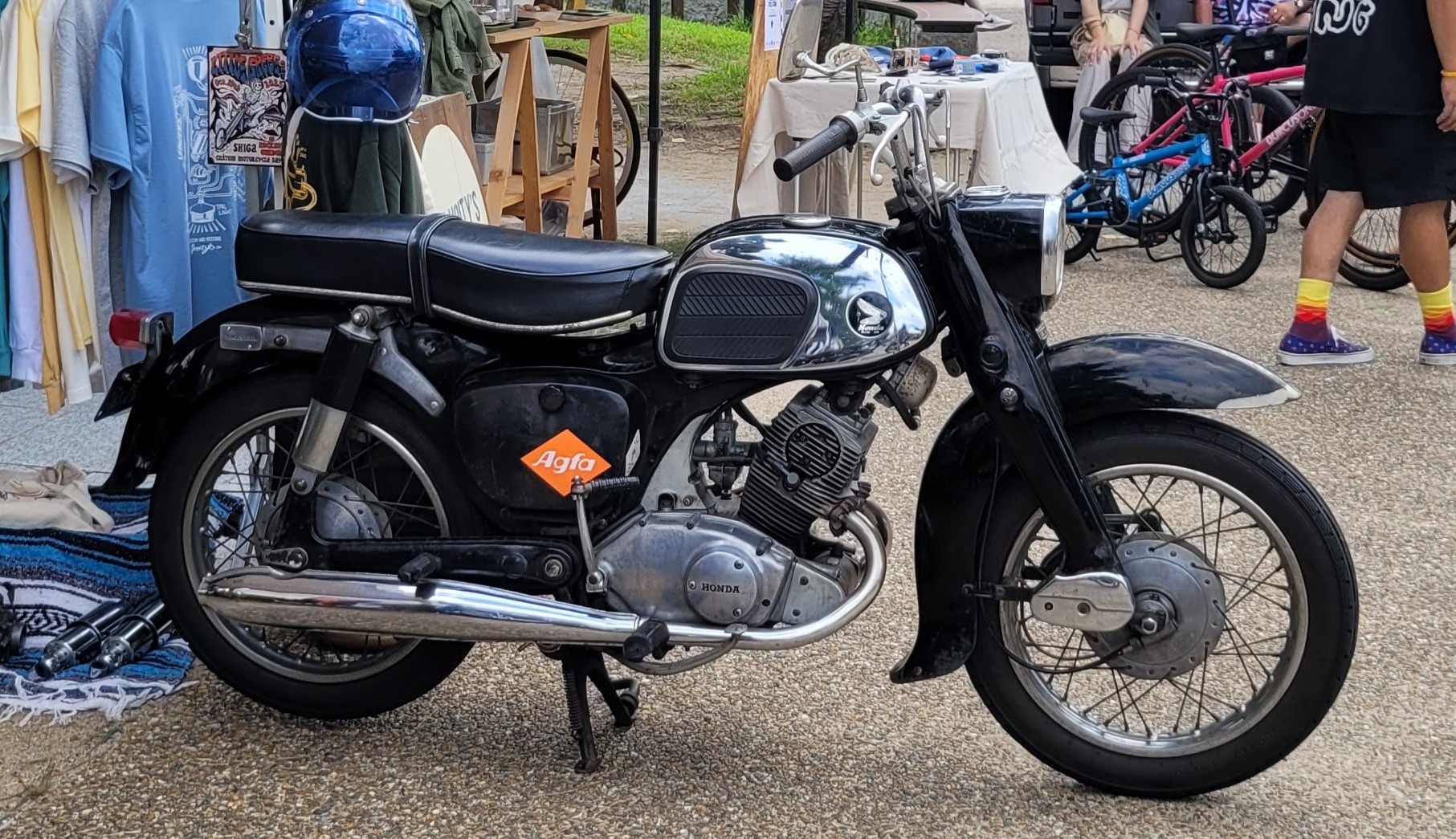 This turned out to be very Americana, with some American muscle cars and very old bulky Chevys, a few very-lifted pickup trucks, and some extremely chopped Harley Davidson motorcycles on display. There was a wonderful vintage Honda 125 motorcycle from 1965, and I had a long chat about vintage motorcycles with the guy at that tent, and at the end he insisted I accept a gift (a cartoony sticker about engines) because he was so surprised I knew so much about vintage motorcycles. Which was nice. One rarely gets tangibly rewarded for being a motorcycle bore. Next time you see me in person, make sure you are sitting very comfortably, and then ask me how I knew the choppers on display were all originally Harleys from the angle of their V-twin engine cylinders…